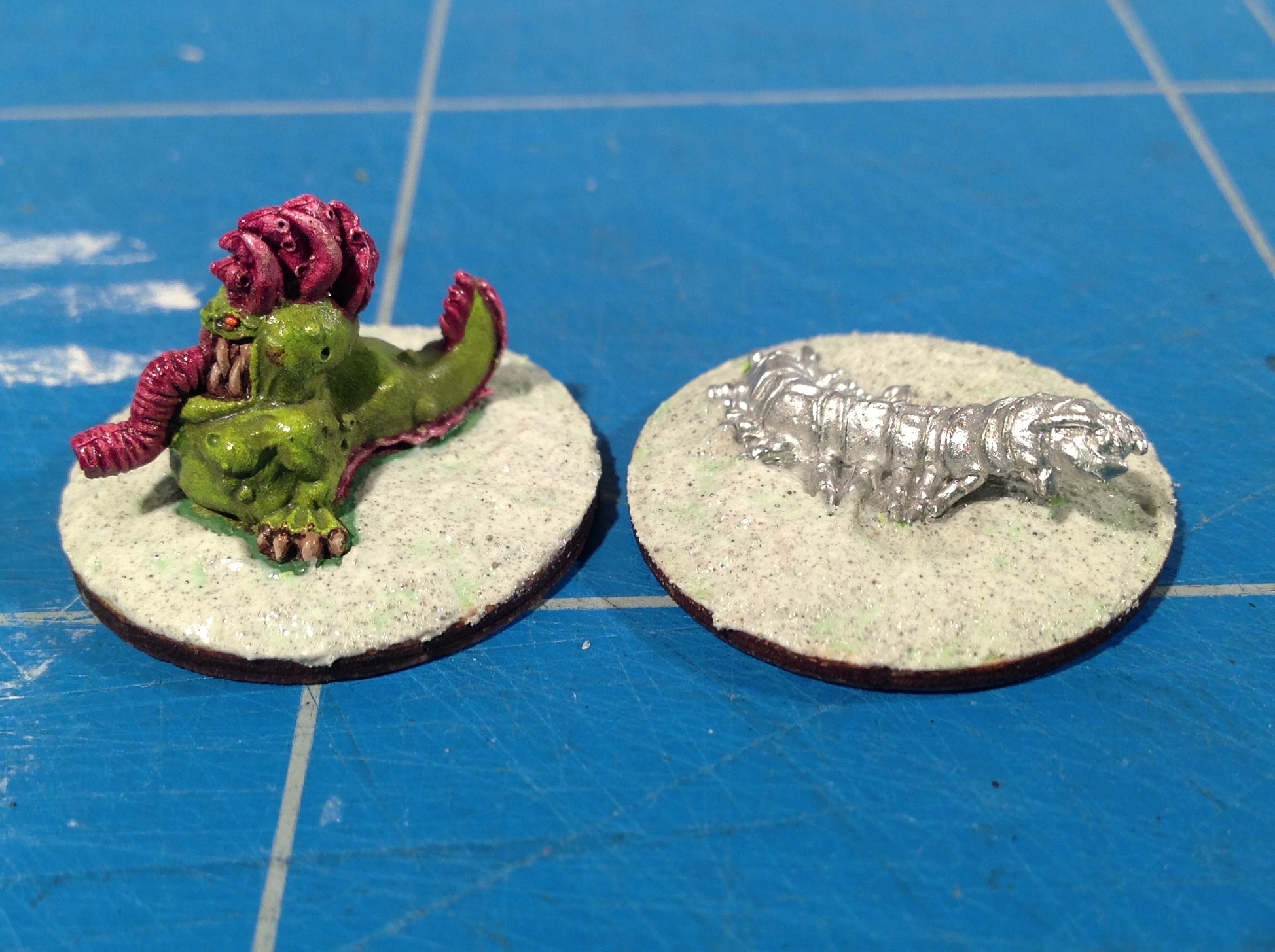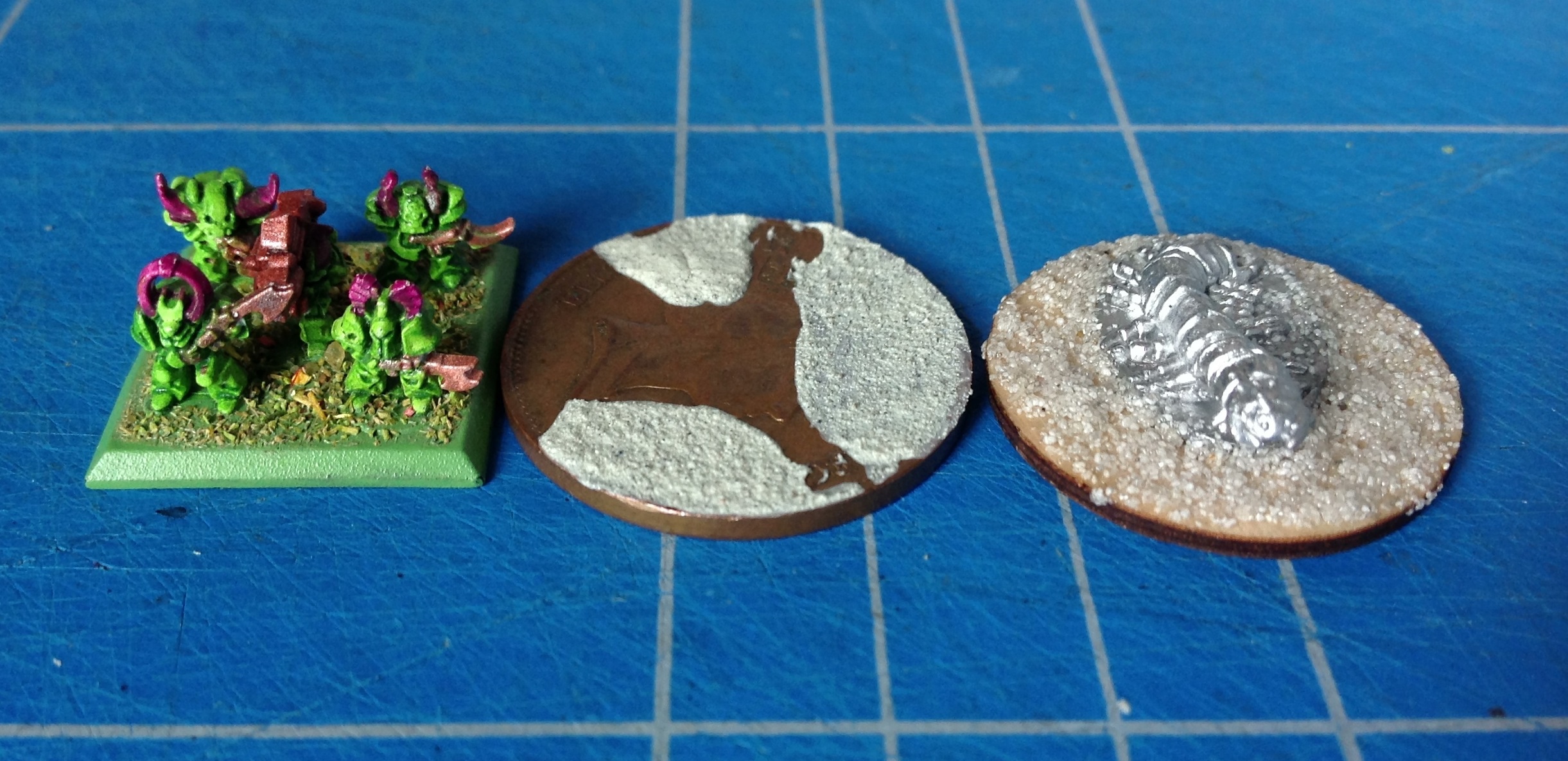 Attached are an earlier test on a 2p piece which has dried and the still-wet paste on a Beast of Nurgle and centipede thingy.
