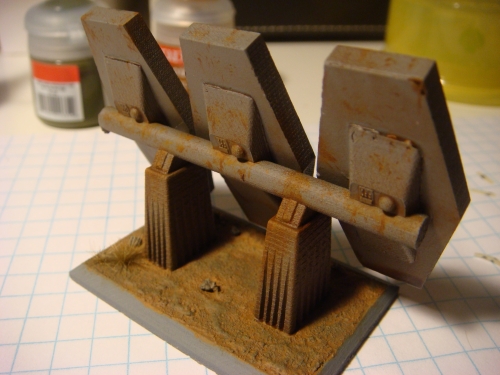 OK well figured I need something to actually fight over so I decided to build up some objectives. Based on another thread I was inspired to bust out an old xmarx radar station I've had sitting in a box for years and paint her up. I went for an old weather beaten piece of machinery, dusty and rusted from years exposed to the elements, half forgotten until war makes securing her a vital asset.