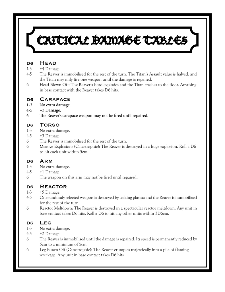 Catastrophic Damage: Some hit locations list a second 6 result on the critical damage table. Use this result instead of the normal 6 result if the section has already been critically hit previously (i.e., any result other than "No extra damage") and the Titan has lost at least half of its damage capacity. We recommend you keep track of previously hit sections by placing a spare blast marker on the space on the Titan's datafax.