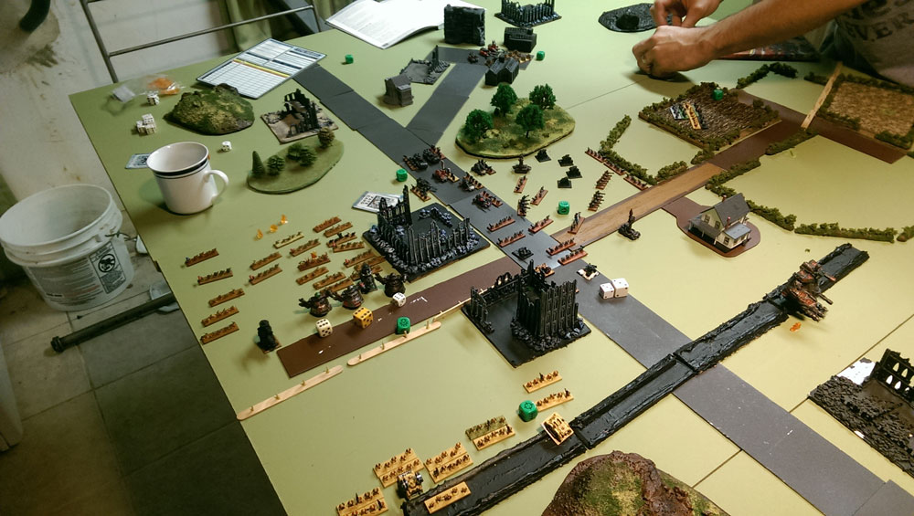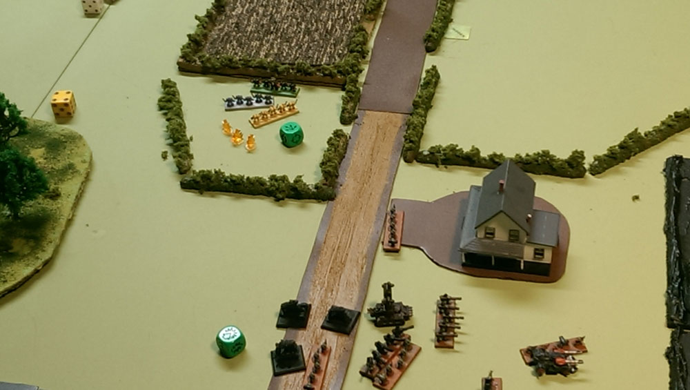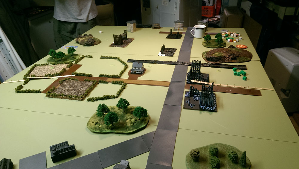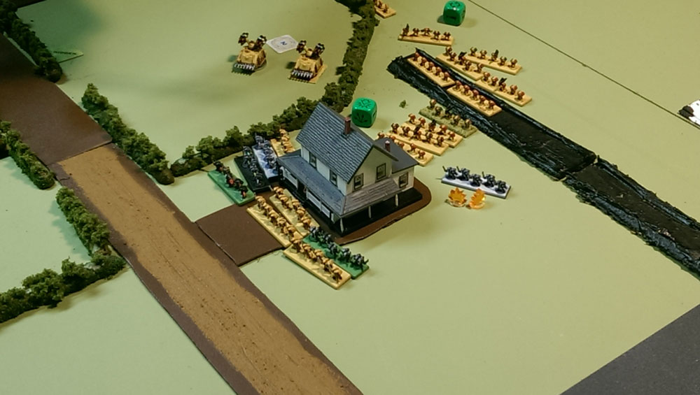 File comment: His assault troops revealed their hiding place in one of the bocages and leapt to assault my boarboyz after the Whirlwinds pounded them. The orks won, but at a cost and drove the assault troops back.