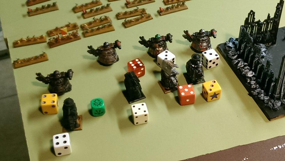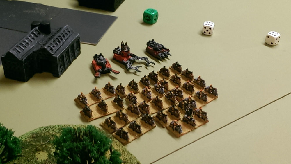 Since this was a breakthrough scenario, I wanted hard-hitting formations that could take a punch and keep slogging forward. No speed, no trickery and no subtlety. I picked a unit of boarboyz, a unit of foot-slogging Snakebites backed by grots, Stompas and Squiggots, a unit of BloodAxes filled with plenty of long-range fire power and a commanding general.