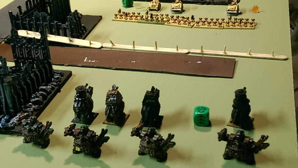 The Imperial Fists player took specialty formations- a unit of assault troops and units of tactical troops backed by Whirlwinds. As the defender, he lined his side with razor wire (the unpainted popsicle sticks with posts in them and trenches (the unpainted black thing) while using his option to hide to great effectiveness.