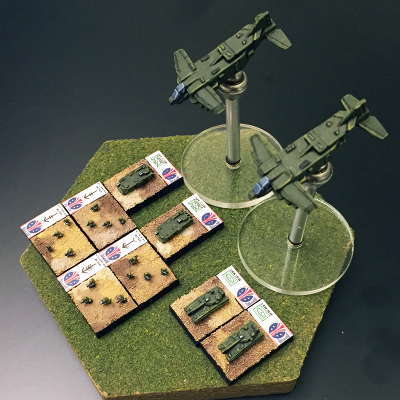 So I did a little something in the five minutes between things today. These bad boys are M75 "Westmoreland" heavy battle tanks of the U.S. Colonial Army - not yet properly based, of course. If you think the war on Linna 349 is confined to the Colonial Marines you're mistaken. Distinguished by the yellow flashes, these main battle tanks, too large for transport by even the heaviest Marine dropcraft, are from the First Cav, the vanguard unit of the USCA forces on Linna 349.