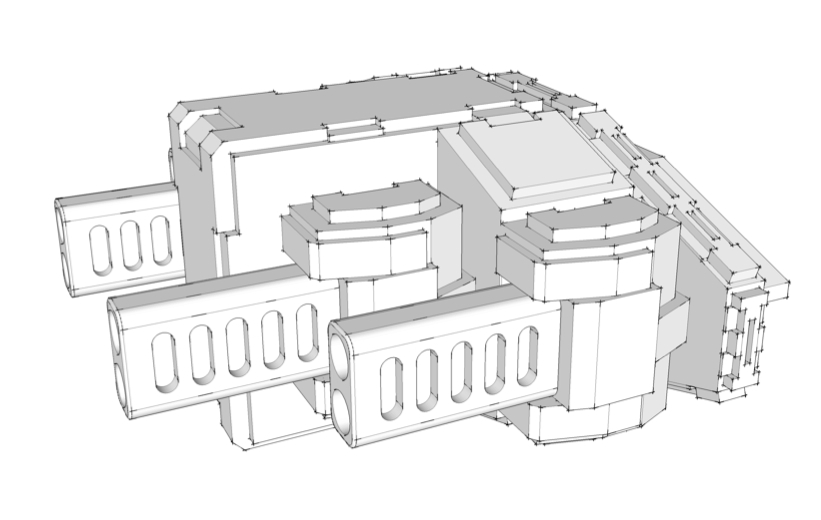 The one on the right is the old original turret, the barrels are too thin to print out without them bending. So I made the first variant (middle turret) which is the standard one mounted on the ships. However, I wanted the turret component to have something a bit different, so I started working on another variant (left turret). It still needs some beefing up, especially at the back.