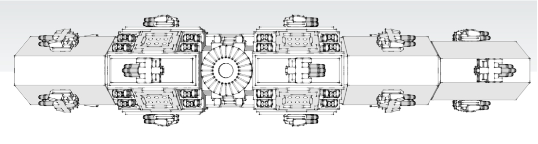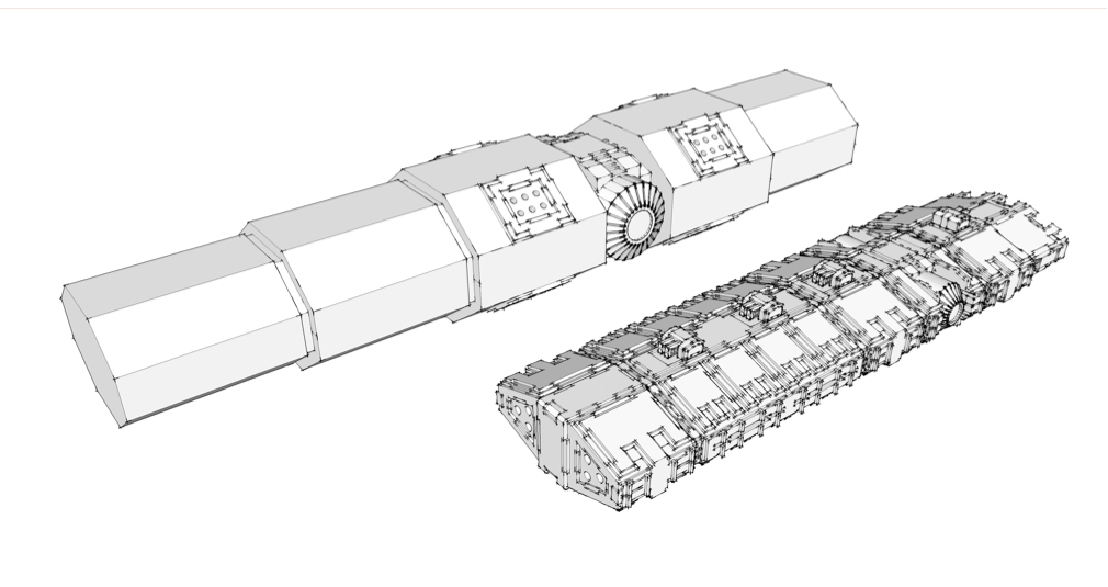 Been doing some more work on the battleship, added the big turrets. Do note that the hull will still need a lot of work to make it all work. I've tried to stick to the original concept art as much as possible, but it can become a bit of a challenge, especially since I want both the ability to fire all turrets in the same direction (depending on which side of the hull you are of course), but not have the heights of the different segments differ too much. Hence, I moved the second components' turrets on the diagonal panels, and added some extra levels to heighten up the turrets on the components closest to the Distortion Engine so they won't hit the turrets on the front if firing forwards.