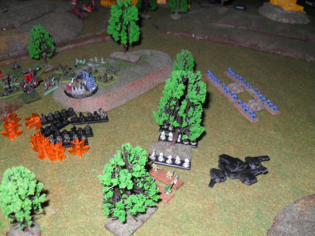 The Capitol Imperialis. I sustained with it in order to clear some opposition for my dropping Kill Teams. I hit two formations and ripped them up pretty bad. Now I had my IG inside the CI so indirect firing was a questionable tactic. As it turned out it didn’t matter if I moved that CI up at all. With a 10cm move the game was going to be over before it would ever come into play, even if I marched it. The armament on it is not terrible, but I wonder how often I would want to sink 600 points into a 6BP artillery piece? I suppose I could move it up, but then I am missing out on any usefulness for a turn. One thing the CI is not good for is transporting troops. In retrospect I would have been better off garrisoning them.