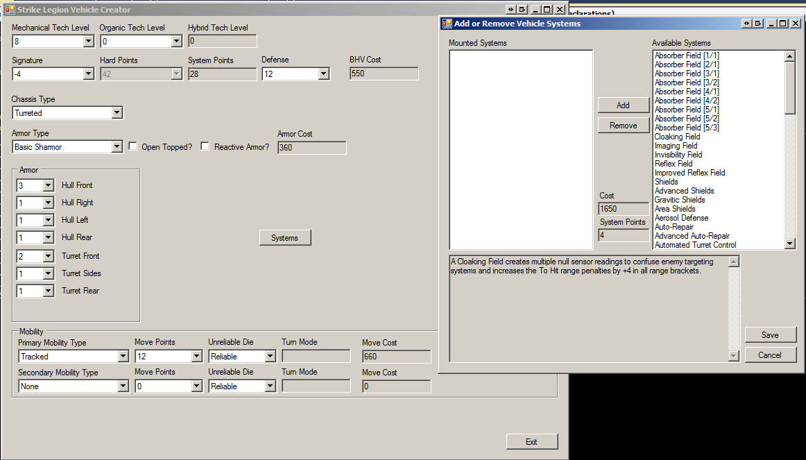 I am now loading all the systems. When you want to add/remove systems, you'll click a button and it'll popup with a new form that has a listing of all systems you can use (based on things like tech levels, vehicle size, and various required/excluded systems), set a rating, see its cost, and add/remove it to the vehicle. Oh, and I show you the system description in a little box below it, so you can see what it does in game.