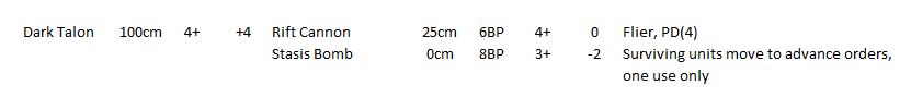 The stasis bomb is obviously a bit of an issue, it's supposed to slow down the enemy (not in terms of movement, but of initiative). I figured this into messing with Orders, but this might be a bit OP if you get your timing right, so perhaps it should be some sort of CAF penalty instead? In 40K it looks like a serious penalty, so maybe -3 CAF? Just noticed it's quite low Strength in 40K so should probably be 0 TSM.