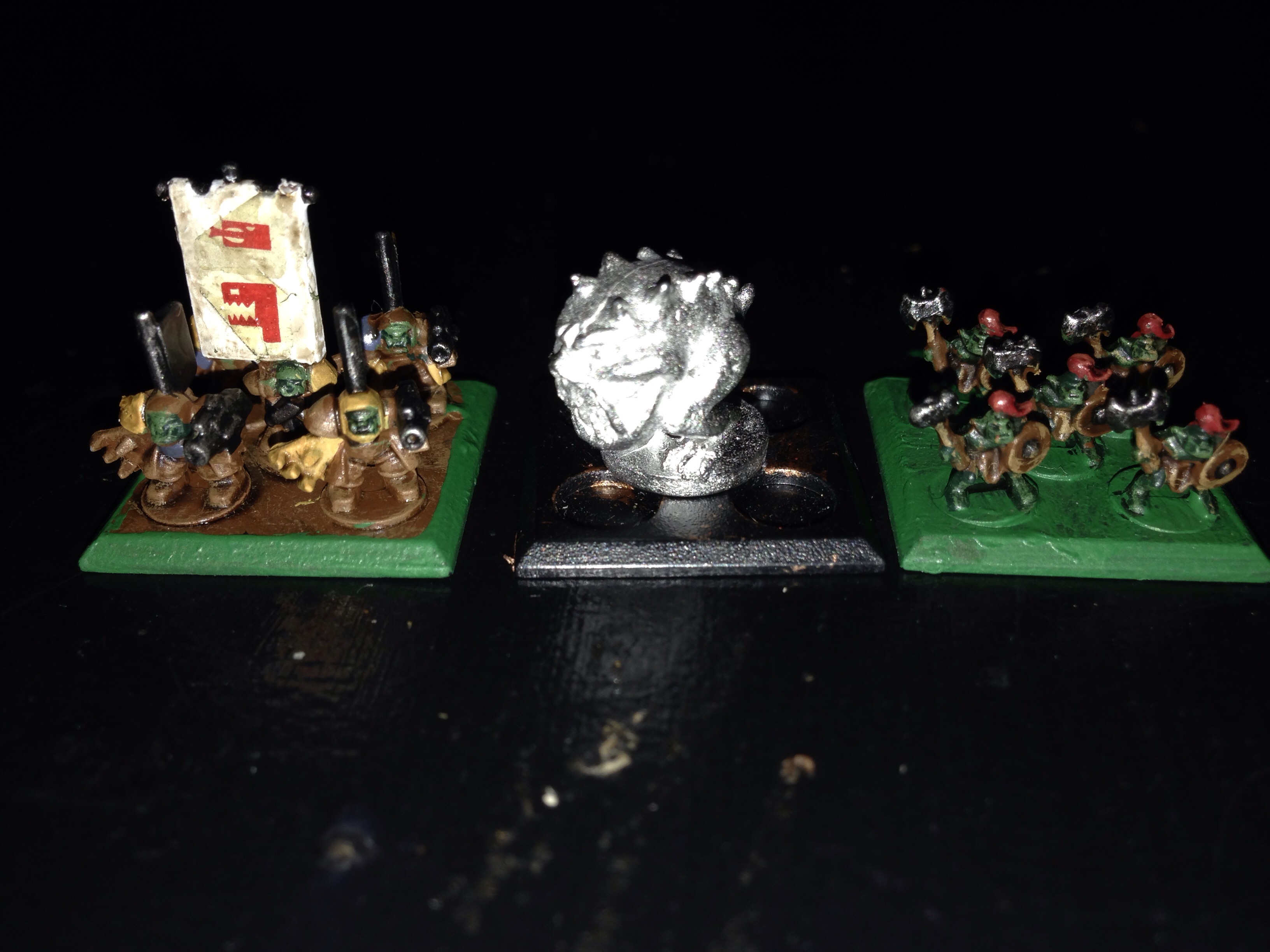 I've also painted up the war squigs which I think should be comprised of 5 stands. I'm going to field test a few rule variations. I've included a photo with the 5 models and a nob stand for size comparison. To the right is my scratch built armoured war squig, kind of a replacement dreadnought so would be only 4 stands in a detachment. Let me know what you think.