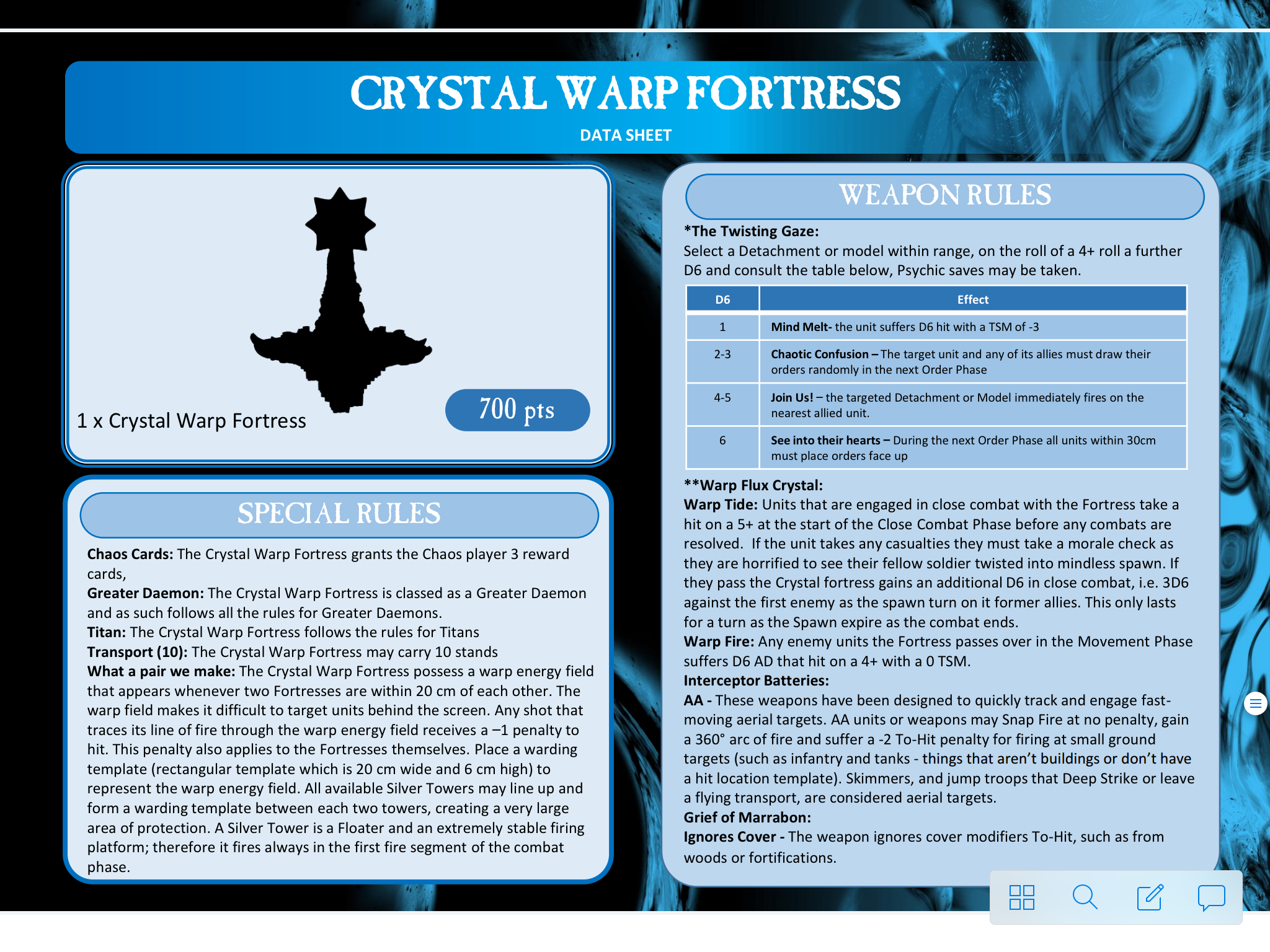 Though not Horus Heresy I was asked to create some rules based on the Crystal Warp Fortress by Infinity Engine http://stores.ebay.co.uk/Infinity-Engine
