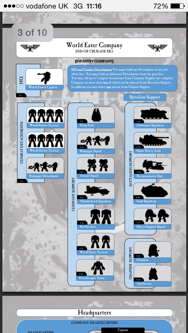 I like them flames of war system it has a lot going for it. We could be creating very thematic armies with equipment and support that would be following along with specific type formations. Armoured companies could include infantry but would have it in limited numbers, we could have lists specific to clans or imperial worlds, chapters and craftworlds. See example below for a heresy era space marine list. I think it has great potential not only because it looks cool but the forces would reflect what the companies, clans, chapters would have available.