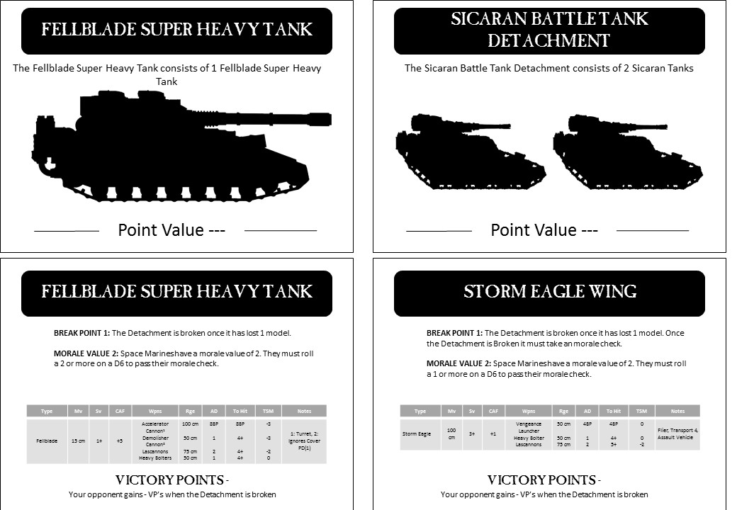 4) Fellblade Super Heavy Tank - Twin Accelerator Cannon (Long Range battle cannon), 2 Quad Lascannons and twin Heavy bolter.