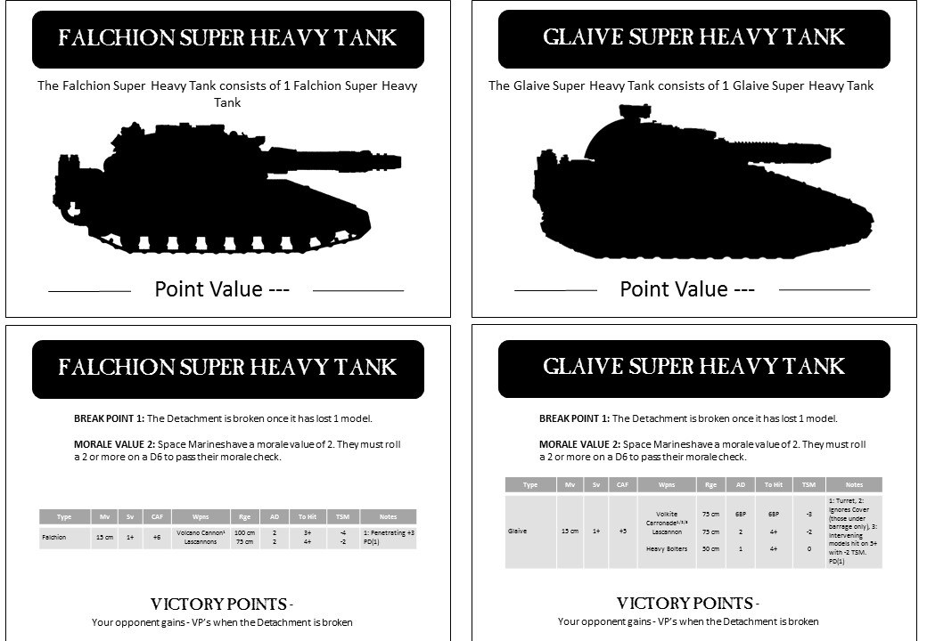Thanks Primarch, Mattmans Stats were nicked and I populated the sheets with these. I find them acceptable :) and I made up the Malcador stats. so as it stands they are all up and ready to be massaged around.