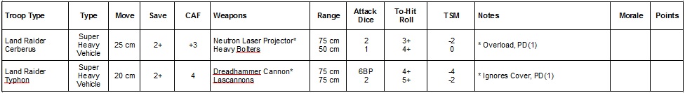The only one I had drafted for my stats was the Spartan. I have assumed the stats we currently have will be used for the Land Raider Proteus and included a new set for the Phobus to take into account that it is a slower vehicle and has an assault ramp.