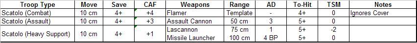 The Furibundas and Deredeo are built very similarly for combat with a single power fist, so both get the +2 CAF. The Deredeo keeps the standard Lascannon whereas to differentiate the Furibundas (the current weapon stats are almost identical) I have changed his missile launcher to be more of light barrage weapon. I have given them the @ symbol so they combine their BPs, but they could quite easily do without it.