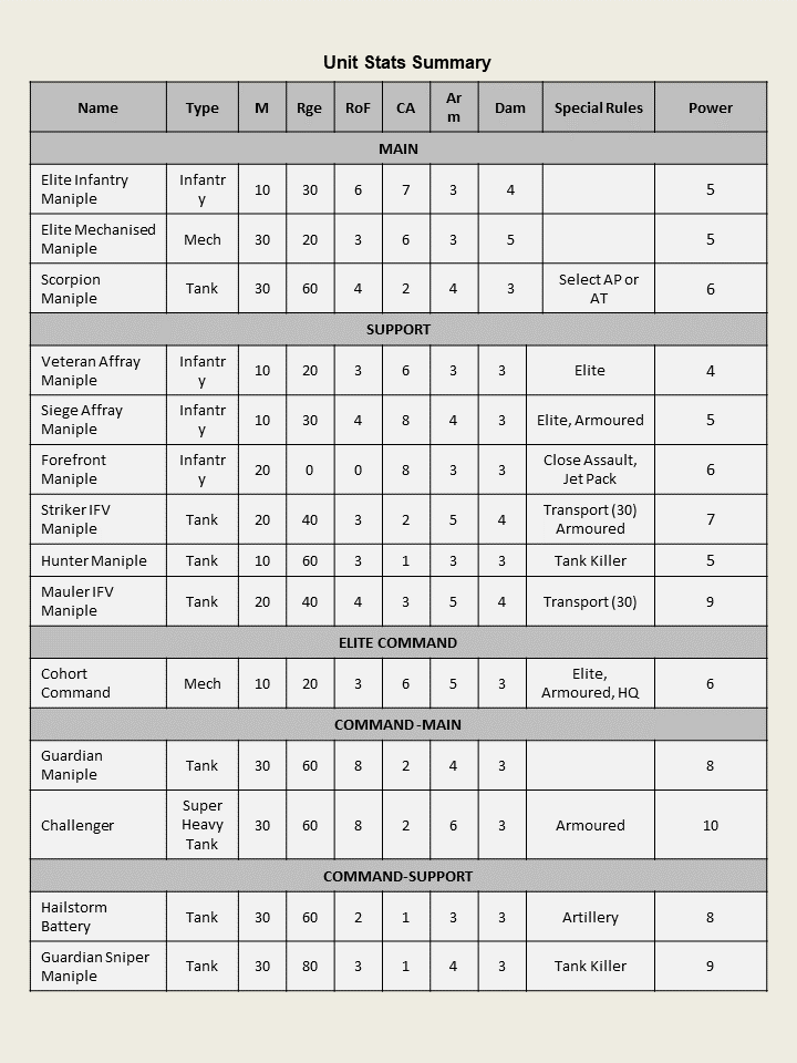 It can be attached to a Century as a support slot or activate on its own. When an Elite Command Stand is taken Elite Command Main and Elite Command Support are available as a further set of options. These are treated in the same manner as Elite Century Main and Support stands with the Command Main forming their own Centuries.