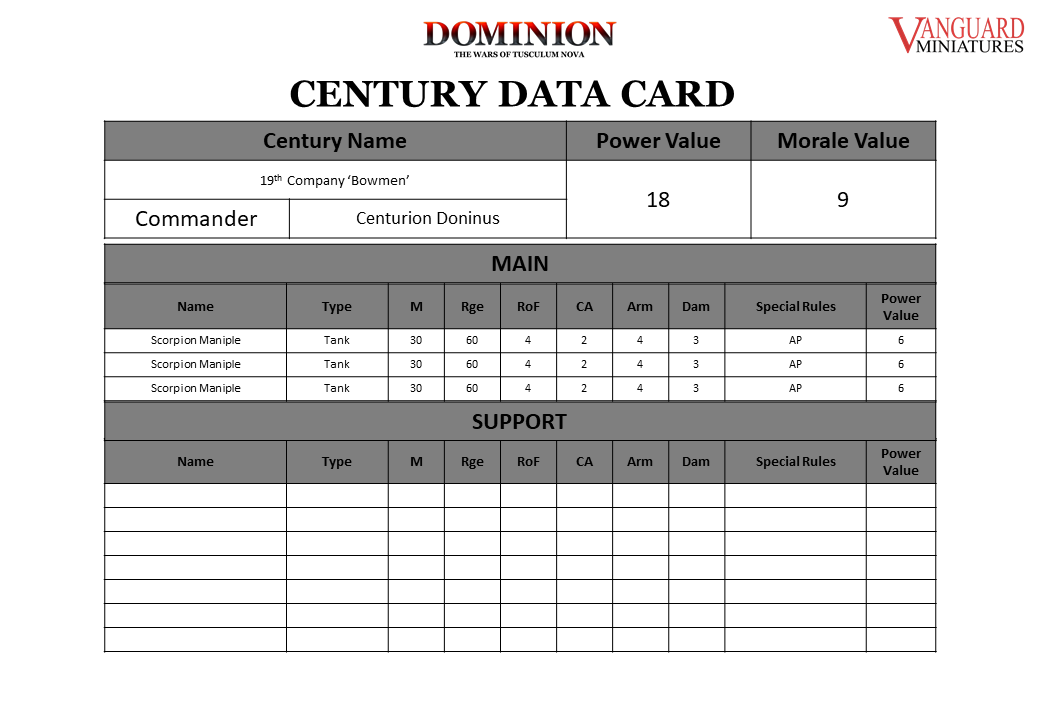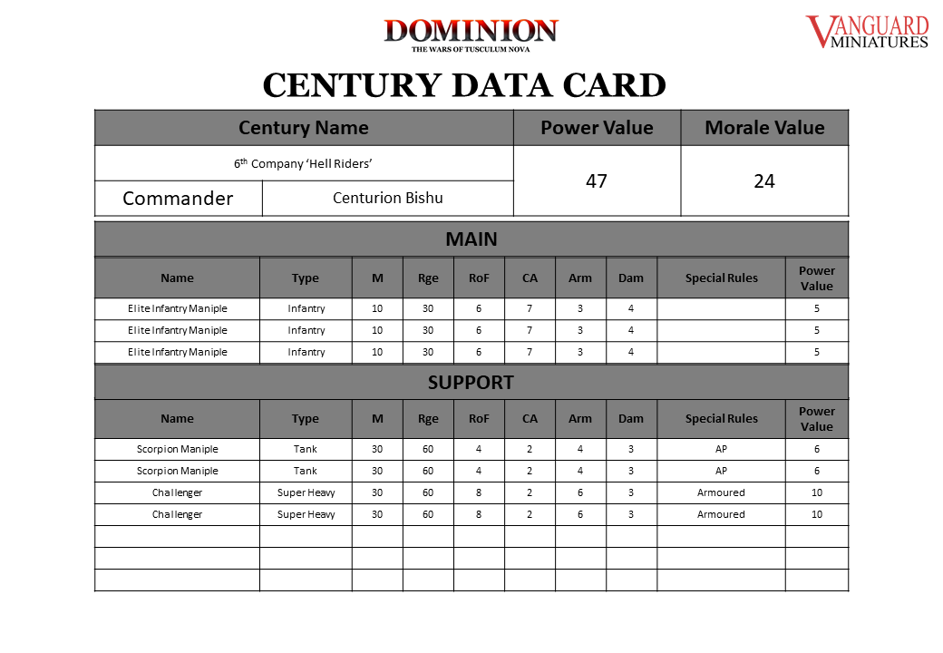 I have also attached a example of a Century which will contribute one activation. As you can see at 300 Power the game will involve many Centuries and is truly mass battle. I've also included a blank to help get you started