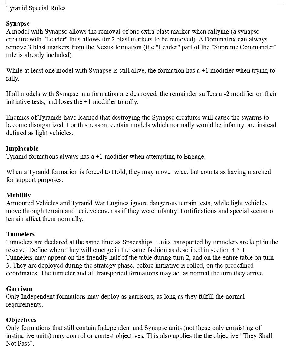Another nice rule is that they give the Tyranid player the option of moving twice when making a hold (but may not support engagements that turn). Played a game against Borka a week ago, and this second rule would really have helped him from being stuck in his deployment the first turn. Fits very well thematically with Tyranids being this horde that surges forward no matter what.