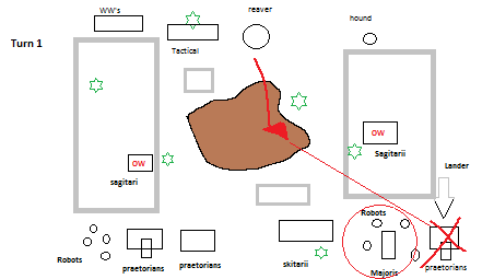 I unfortunately don't have any pictures but I quickly drew up a diagram of the situation. the Sagitarii were on Overwatch in the area of moderately dense buildings (large grey squares). the one on the right did manage to get 2 shields down on the reaver as it crested the hill. During my activation the unmounted praetorians advanced towards the skitarii for the and shot up the reaver taking down another shield, held the initiatve moved the skitarii tot he other side of the unmounted praetorians and shot up the terms, with no casualties. figures the praetorians would fair better in CC with the Skitarii to back them up with FF. Then hound came down killed 3 praetorians (damn MW shots), the WW lit up the sagitarii still on OW. Mounter praetorians advanced forward double action dropped the last shield off the reaver. Tactical went on OW, Robots failed initiative and could only move (supreme commander was previously used). So yeah end of turn 1 Im down almost half my force and all ive done is kill one stand of terms and droped the reavers shields. 2nd turn the other terms tele'd in, the rest is just sad lol.... I did have some insanely poor luck on armour rolls it should be noted.