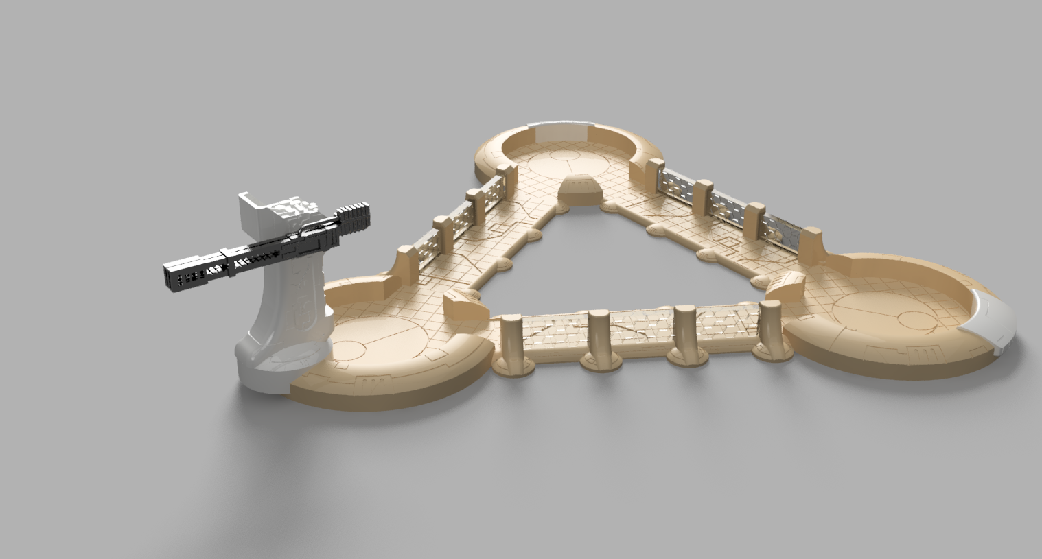 Each "wall section" is large enough to hold one rectangular Epic base. The circular "nodes" has an inner diameter of 25mm the size of a vanguard circular base. Each leg of the triangle is 10cm long (edge to edge).