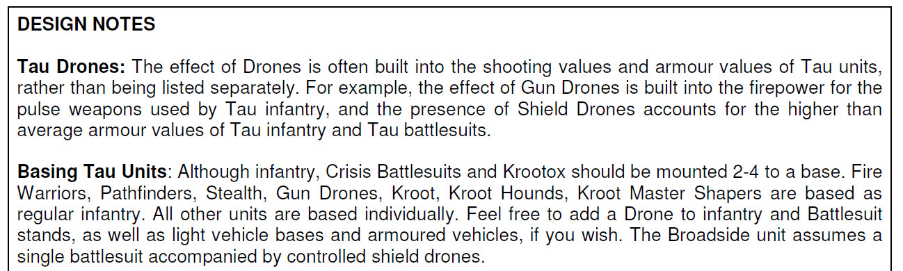 KiC hit the nail on the head. I'd add that one of the goals once the Vior'la heavy suits stats are completed, is to put together a master Tau list. It wouldn't necessarily serve as a tournament list, although TOs could certainly allow it, but rather a master list with all the stat lines for people to select from and include units not currently in lists such as the hazard suit, vespids, and the Tidewall.