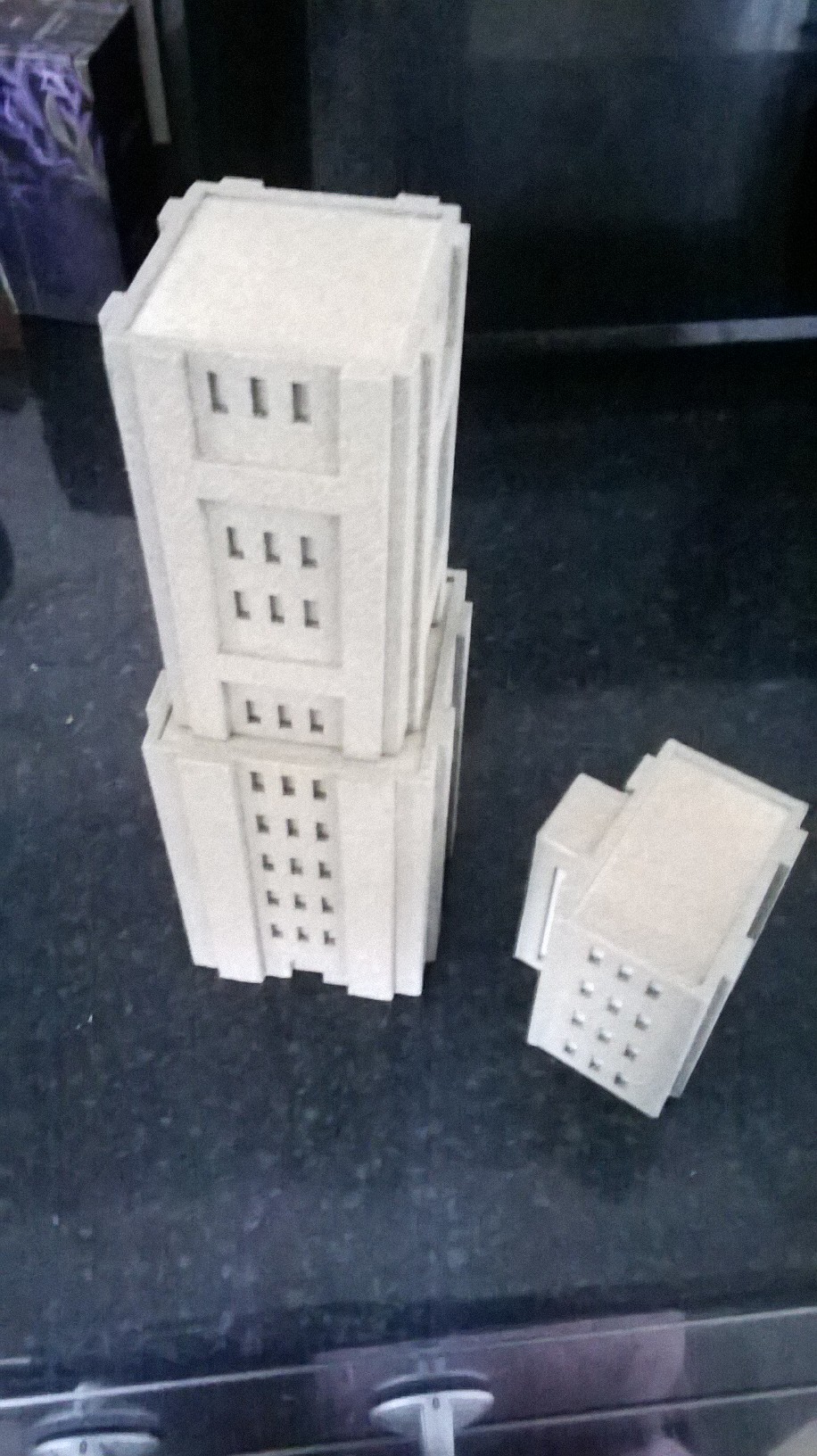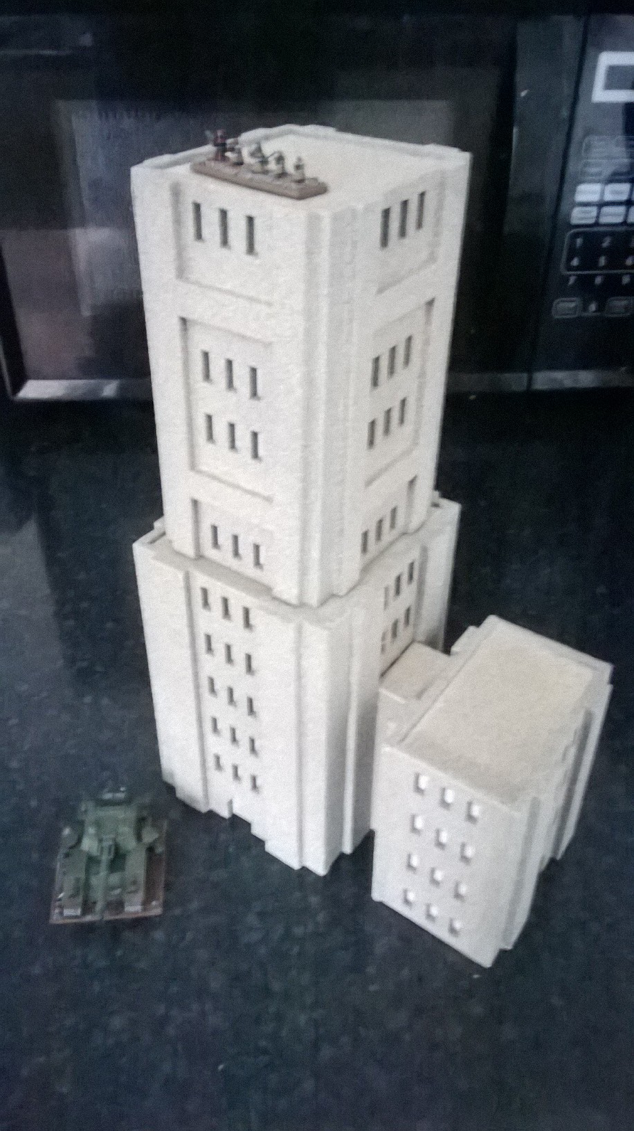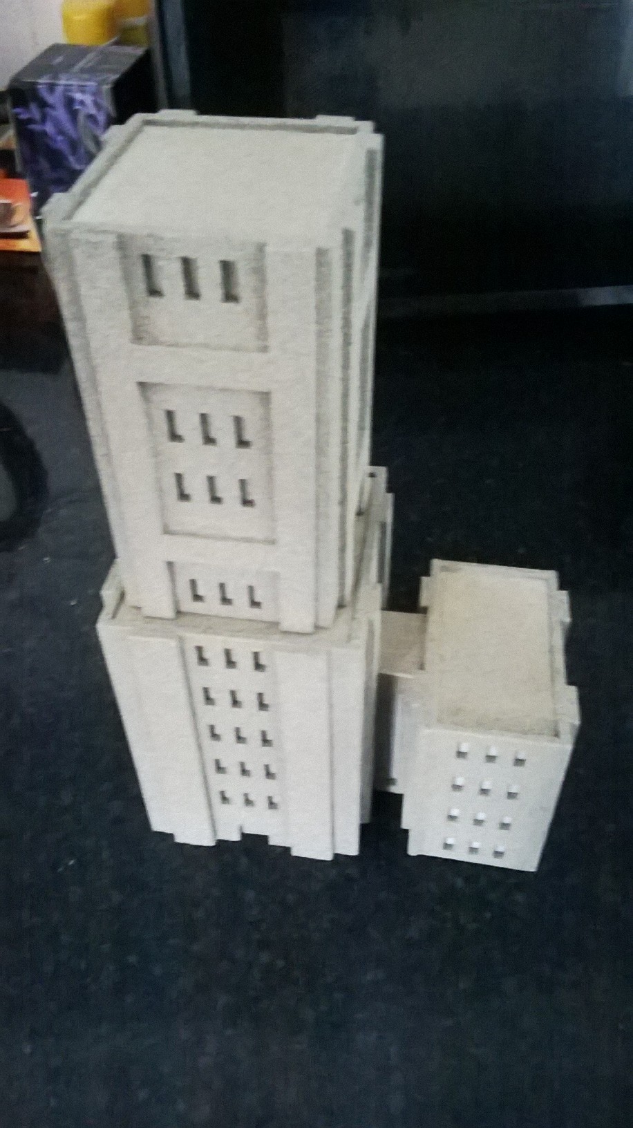 I've eventually got the large tower block finished. This is a multi part piece that once assembled stands approx 240mm high. It consists of 1x large base tower, 1x second story tower and 3 - 4x wing towers.
