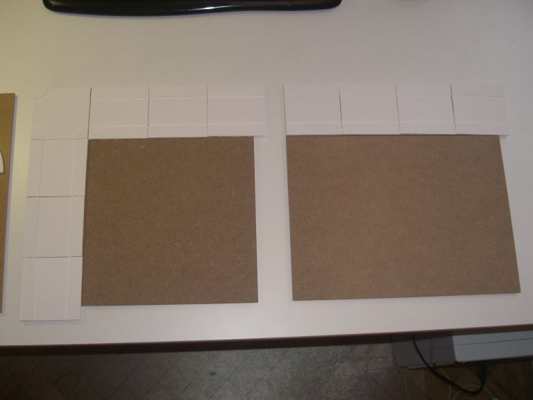 First I want to build a modular city for my gaming table. I decided to use 30x30cm square bases made of 3mm MDF with a second MDF layer on top. There will be three different types: