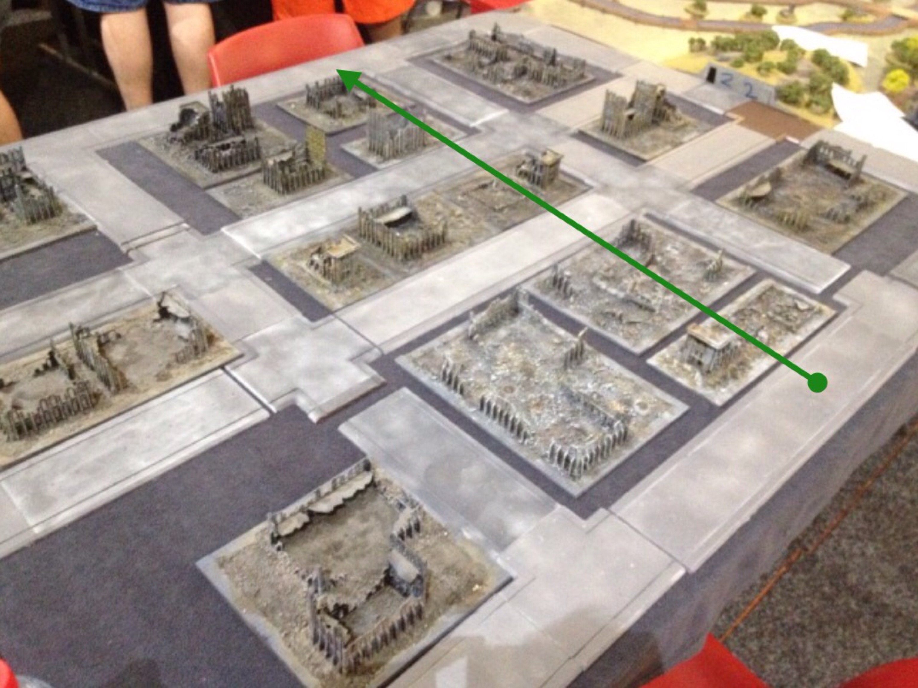 The "5-minute warm up intepretation" for this particular table was that each ruined 'city block' (outlined in red) is a single piece of terrain and the entire square (as defined by the base edge) blocks all line of sight, unless something is tall enough to shoot over