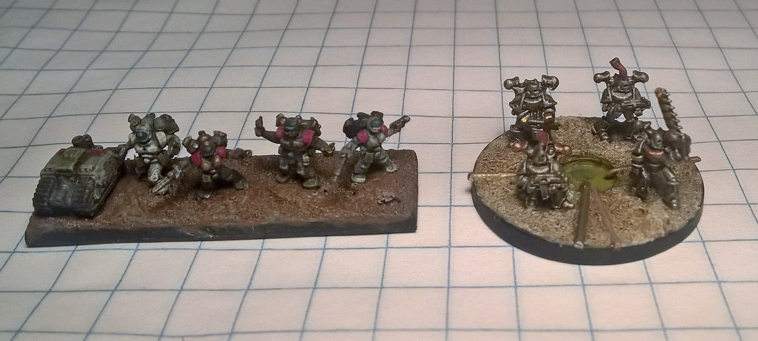 If you have an equal and or greater desire for these to also have a modeling for pleasure aspect and you're into the whole "scenic mini-diorama" base concept then the rounds do allow that to happen more / easier. Also some figures are larger than others and they can get a bit more room on rounds than strips while still not looking "odd" if you go with 4 vs 3 figures in he existing plinth holes (YMMV). I think it's "fair" to state the Iron Warriors stand is more aesthetically pleasing (I mean come on, cesspit!