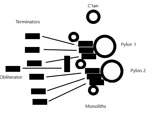 6 chaos terminators + 1 Obliterator assaulting a formation of 3 Monoliths with intermingled (2 independant) pylons and a C'tan (Deciever). See picture.