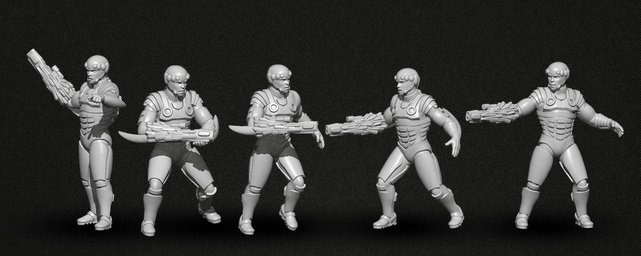 All of us at FatMan Productions are fans of a lot sci-fi movies, tv series and books, so we thought doing a sci-fi game inspired in the sci-fi culture of the 80's and 90's . About the rules we had somethings in mind during development that we really wanted to see in a miniatures game: Fast paced (30-40 minutes per game with about 40 miniatures per player), classic sci-fi looking miniatures (almost cartoonish), and with dynamic mechanics. Right now we have an alpha version of the rules, that we hope our contributor during the Indiegogo campaign help perfect and make definitive. It's a d10 based system, with alternate activation of units, using a system of "command points", hidden to your adversary. The four initial factions have a unique way of playing, so that in addition to the looks of it, the player may choose their faction based also in the game mechanics of it.