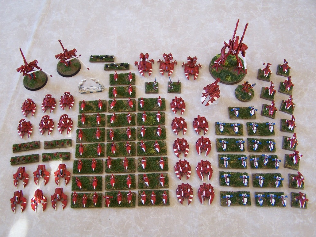 Avatar 2* Fareseer Stand wraith gate Phantom Titan 2* Revenant Titan 1 Cobra (the old one) 3 Night Spinner 9 Falcon 6 Fire Storm 11 Viper 6 Hornets (custom build) 23 Jetbike stands (3 formations) 11 Shining Spears 2 Dark Reapers 4 Fire Dragon