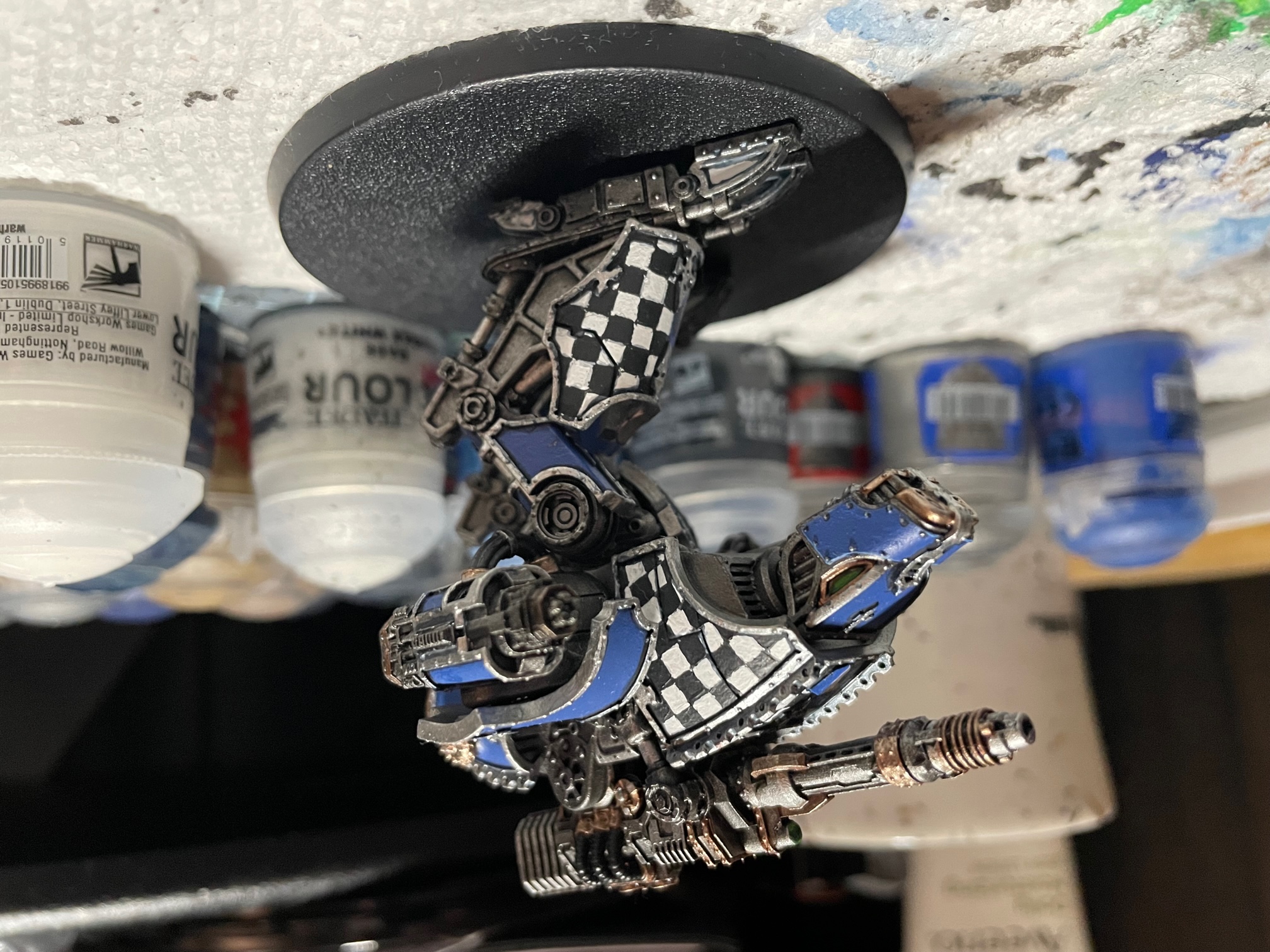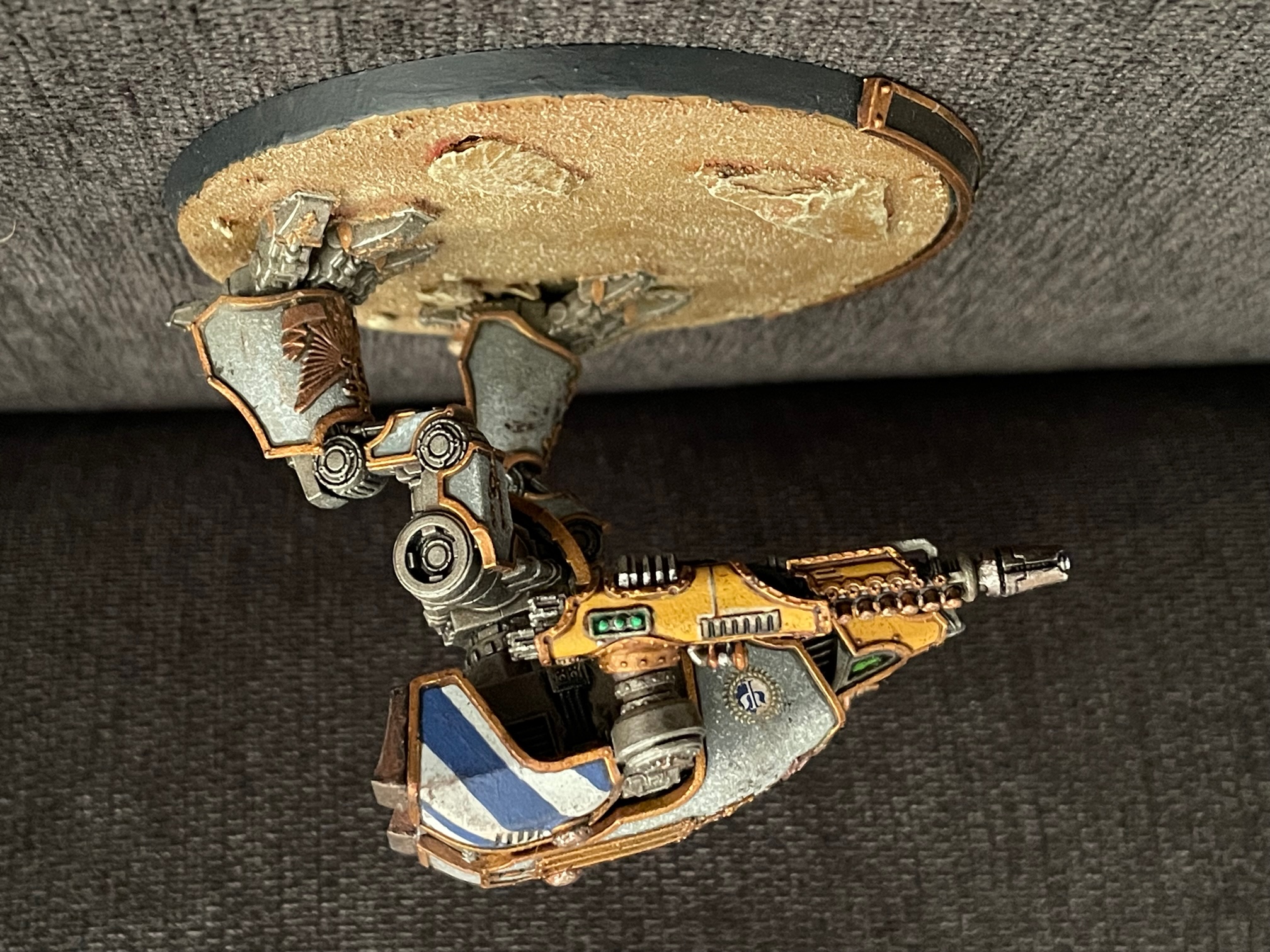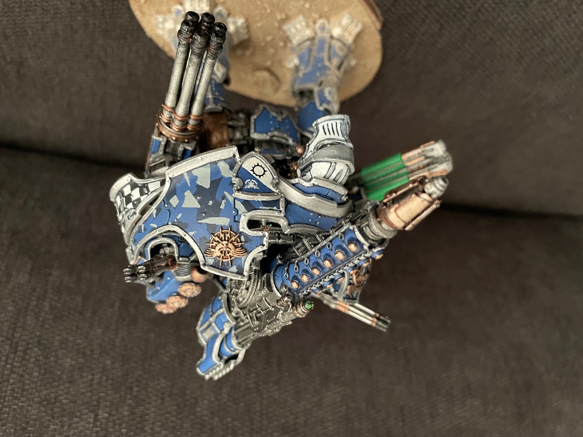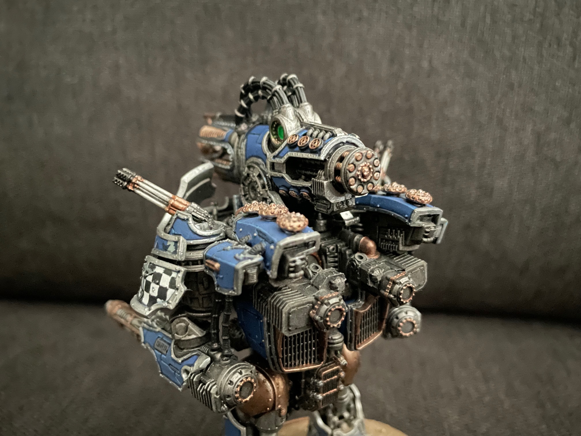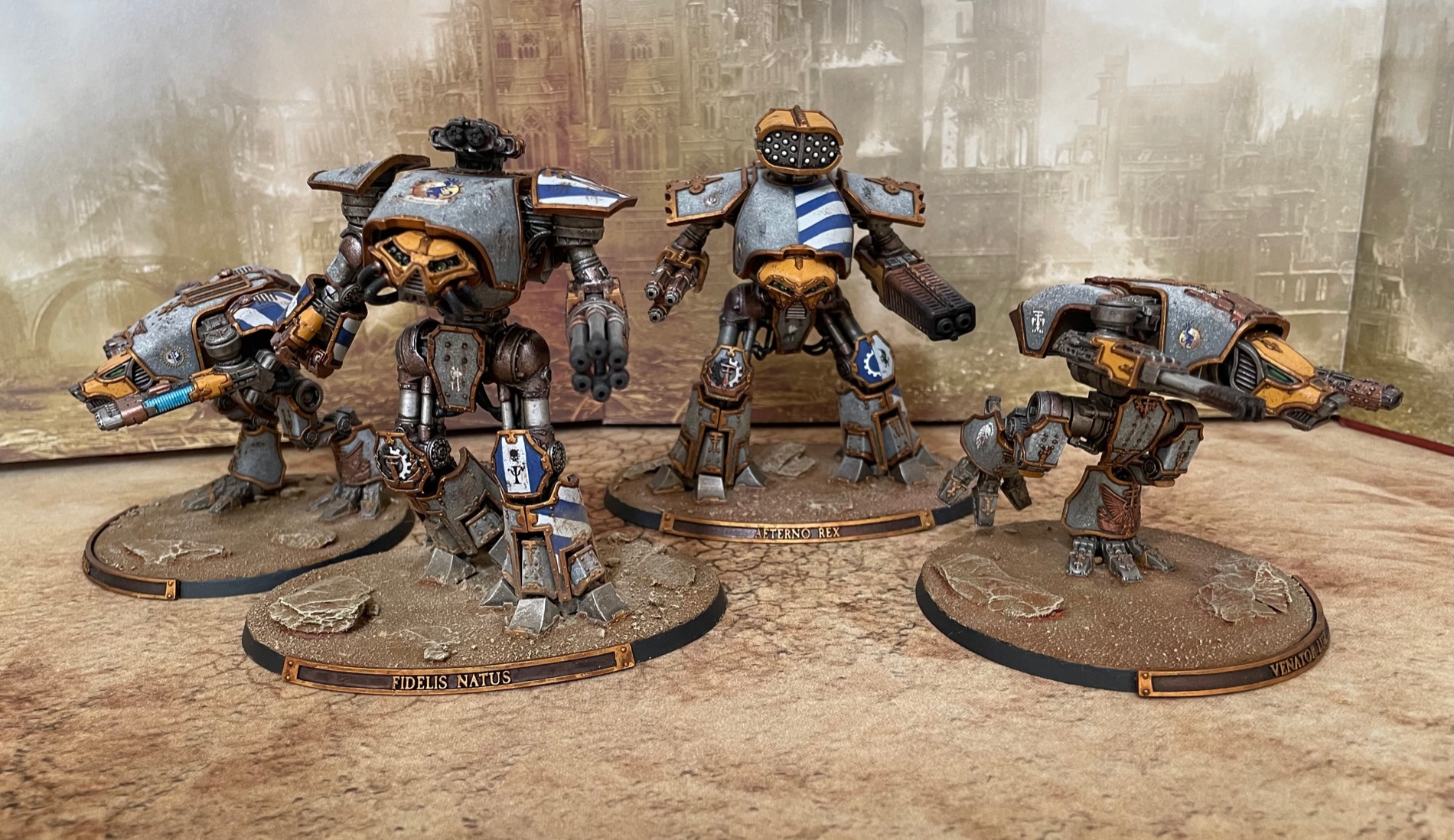I finished up another seven knights for AT/LI, three more Questoris chassis and a quartet of Cerastus Atropos. Haven't been able to set up a fancy backdrop for photography, so here's everybody on my painting table: