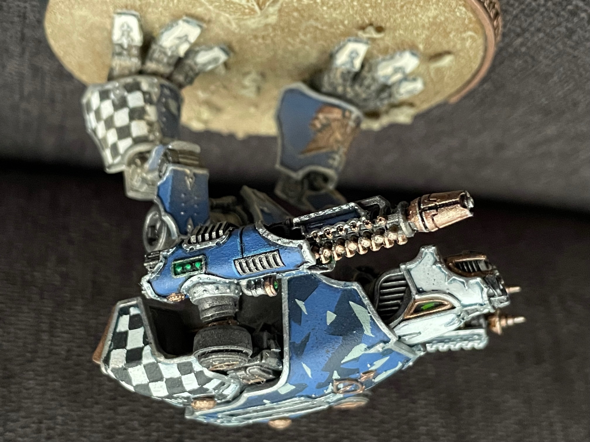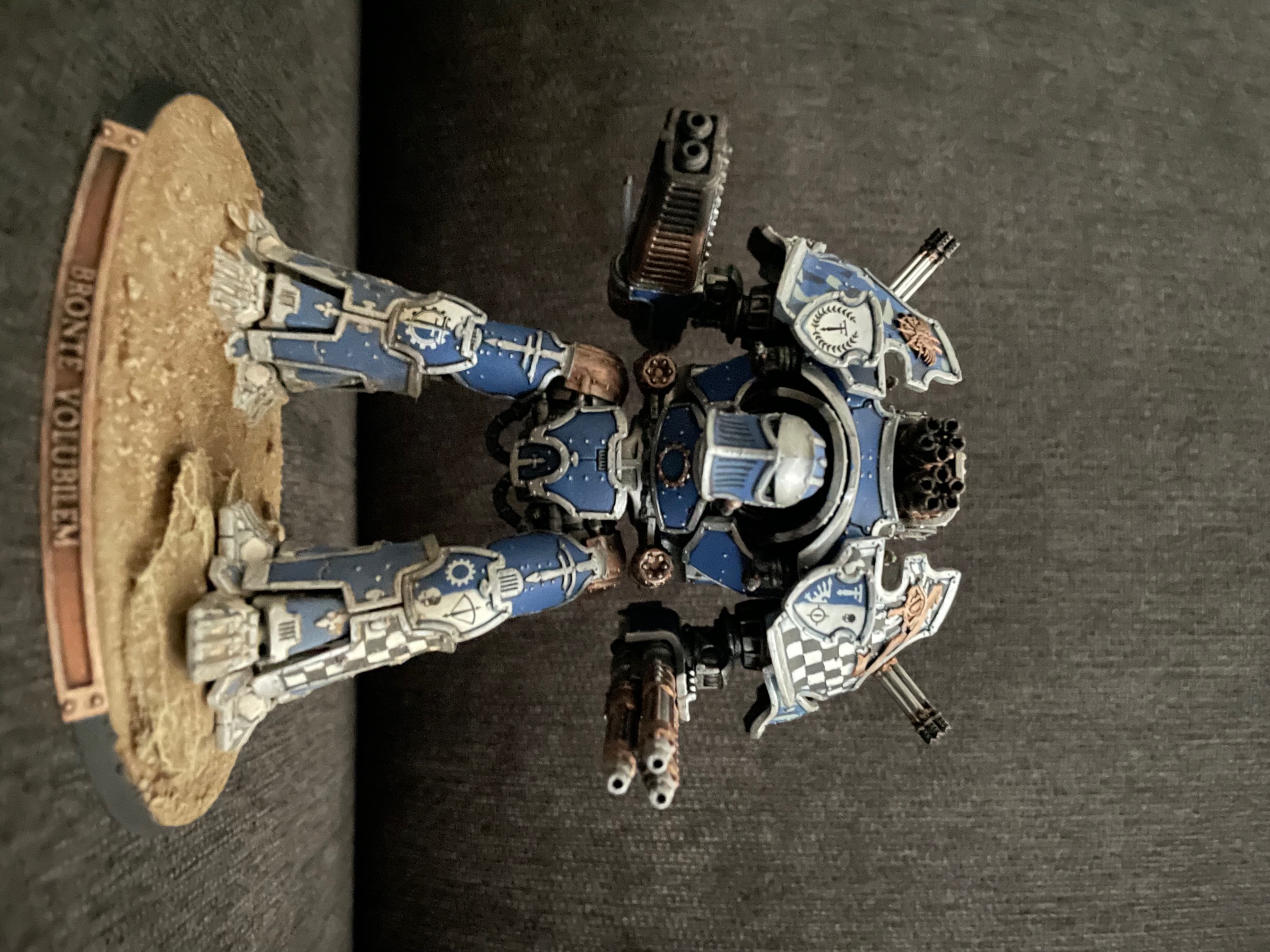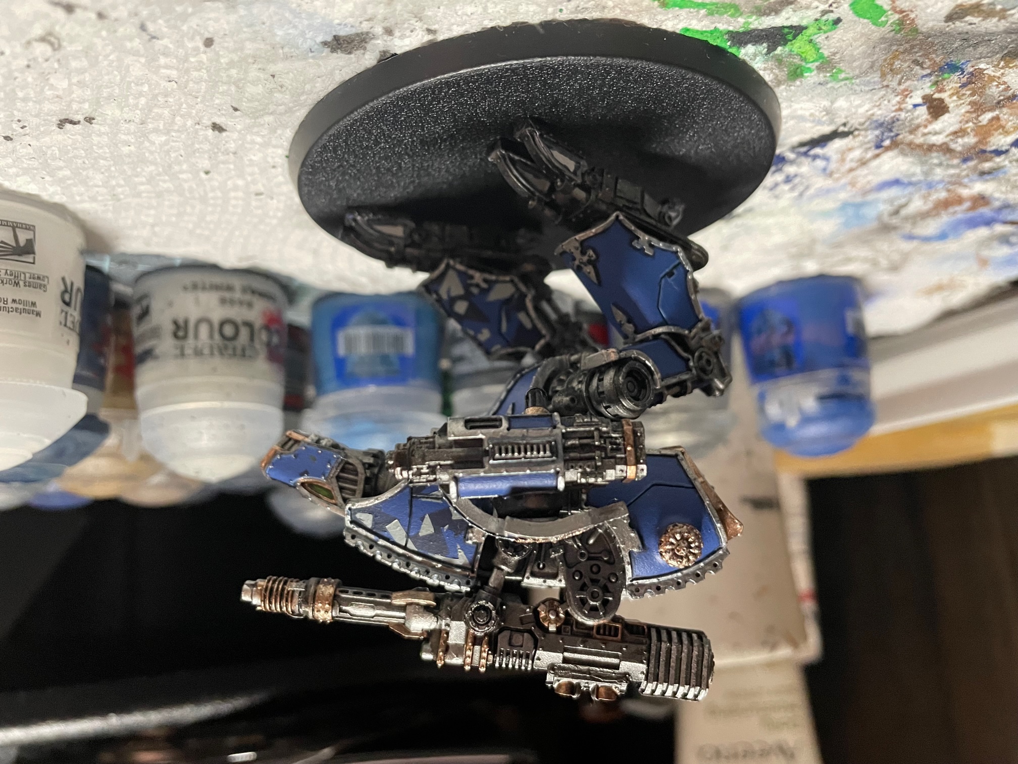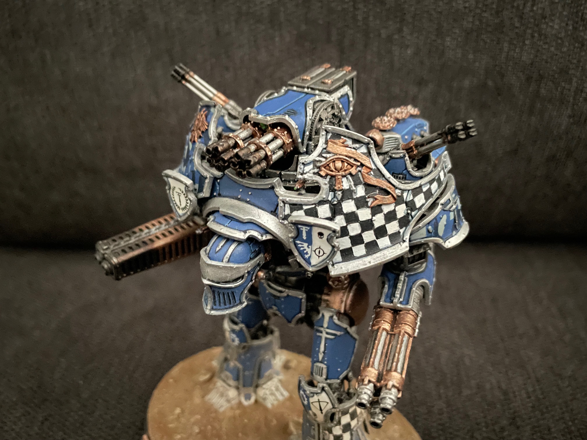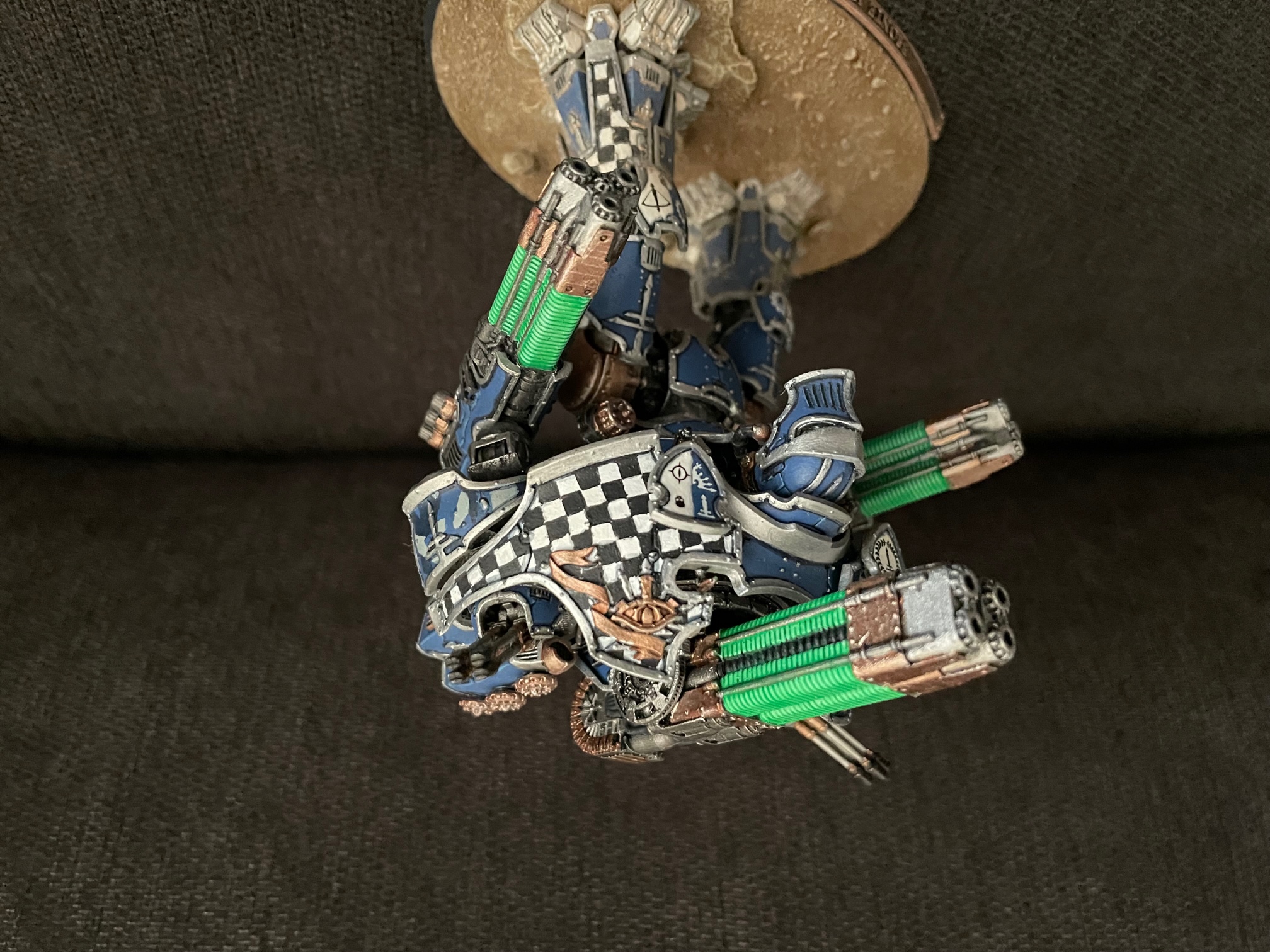I finished up another seven knights for AT/LI, three more Questoris chassis and a quartet of Cerastus Atropos. Haven't been able to set up a fancy backdrop for photography, so here's everybody on my painting table: