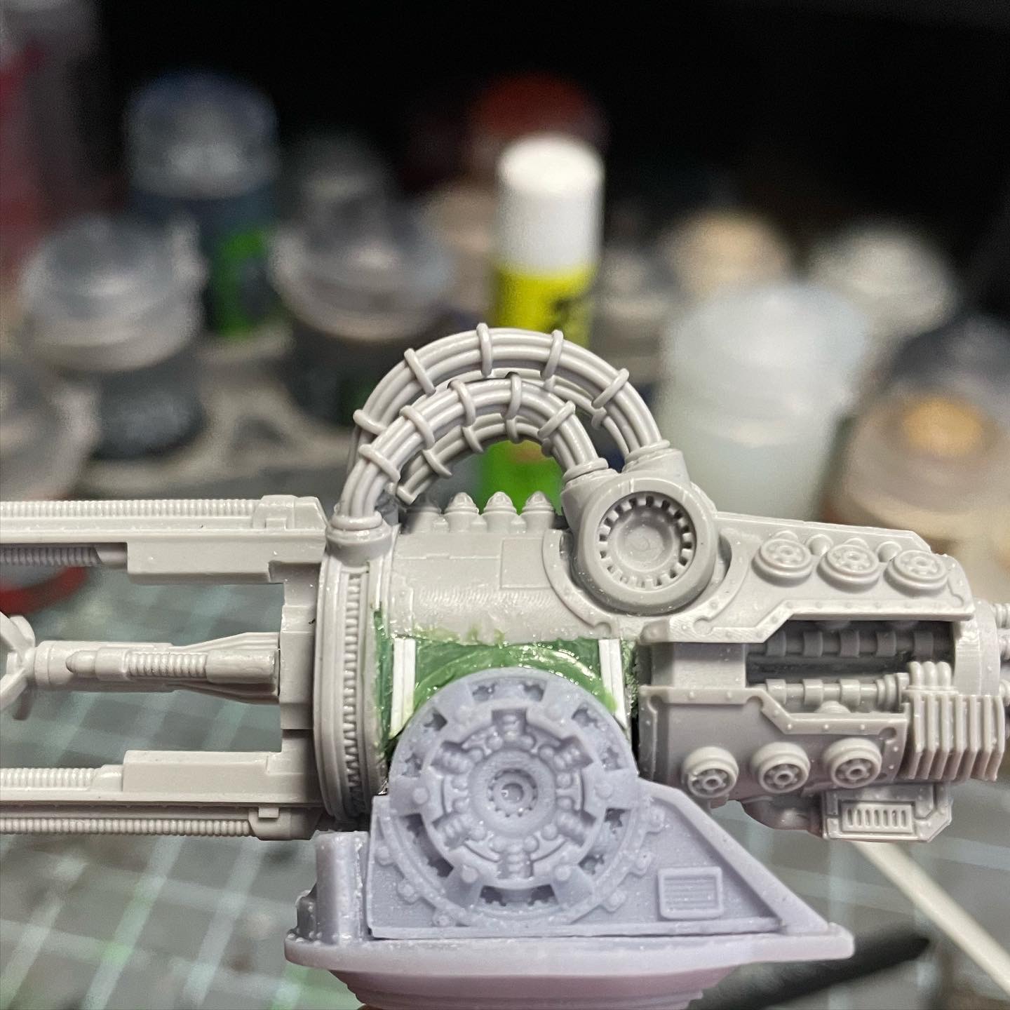 Finally, my current project is (still) converting a Warlord conversion beamer to fit on a Warbringer carapace mount. Finished cutting out portions of the old weapon, fitting the mounting point, backfilling everything I'd cut out around the mount, and building the trim back up with styrene & greenstuff. Once the trim greenstuff cures, it's all going to get a light sand & a filler layer of liquid greenstuff to smooth things out, and then I get to experiment with N-scale resin rivet decals!