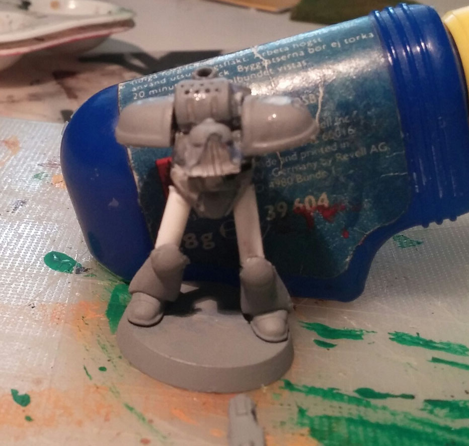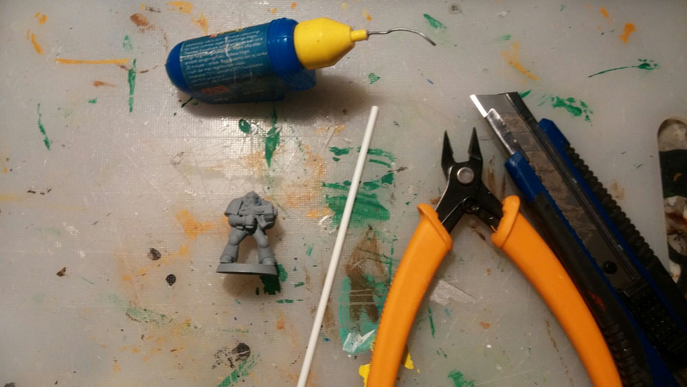 The tools and material. One badly primed plastic space marine, a 1/8” (32mm) plastic rod, also forgot that you need something choppy, for this one I used an imperial guard chainsword.