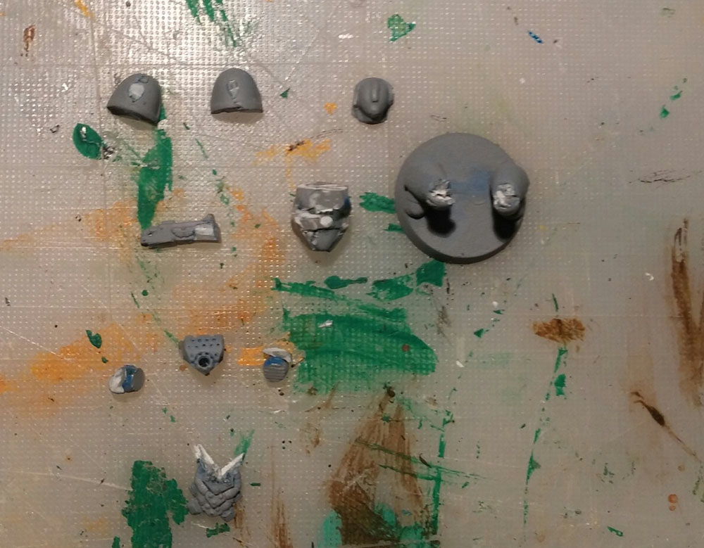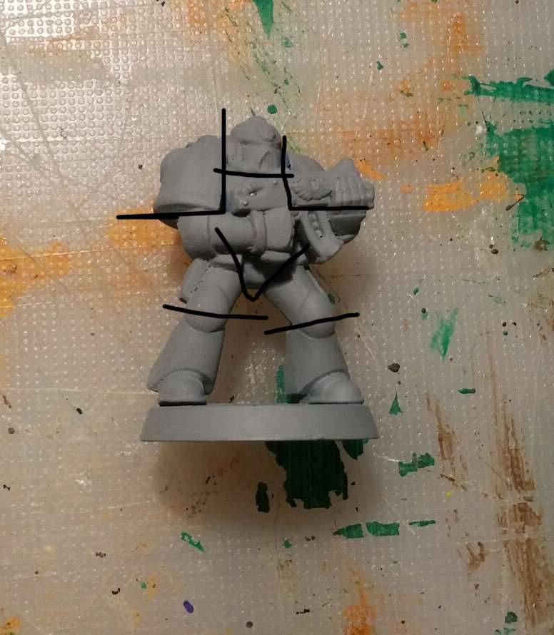 Cut the marine as below. Cutting of the shoulder pads, the upper legs, the head and the arms and gun.