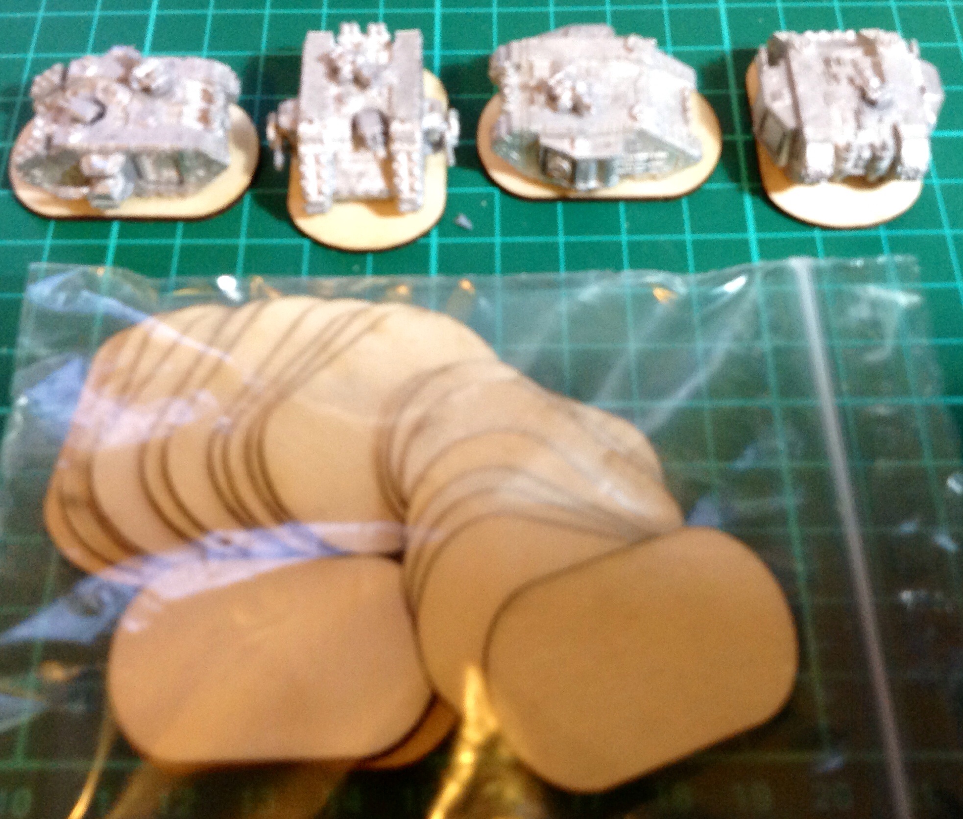 My custom made Landraider bases arrived today from Fenris Games. Their 40x25x1.8mm ply, which means there the same thickness as my round infantry bases and fit in with them really well, behind pill shaped. They are pictured here glued to some of my Landraiders. I've almost finished painting some Rhinos, should have some pics of them by tomorrow.