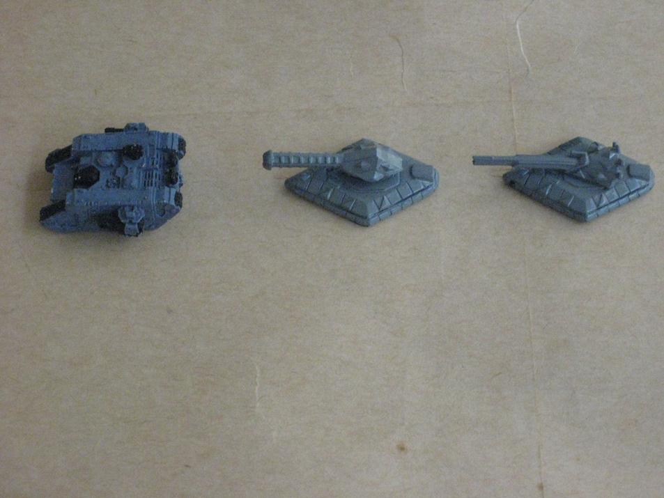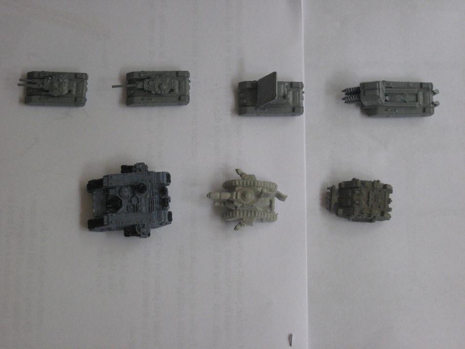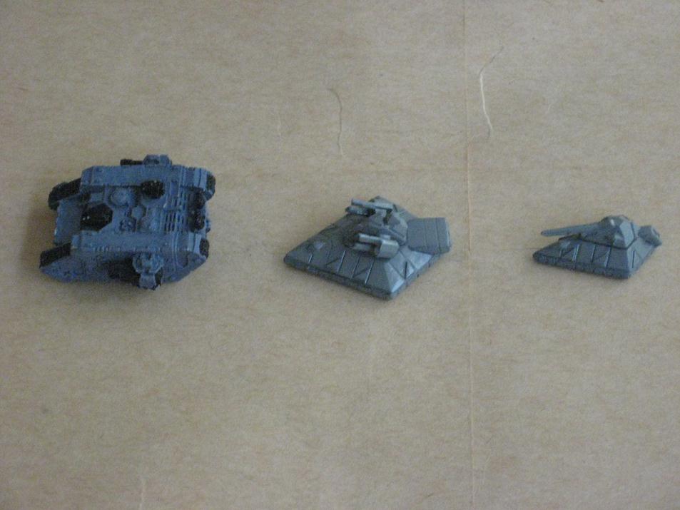 Ok found some old hardkill human tanks afterall. While i have the list of the hardkill human range it doesn't include many pictures so it is hard to correctly identify them. There was about 35 different items in the human range alone. I will start with the little grav tanks first -left to right Baccus CHH4 light personnel carriers (perhaps hardkill SF3 command car with light laser), CHH5 Baccus light tanks (hardkill SF8 light tank with missile launcher) and hardkill SF1 grav scout car ( no baccus equivalent). For size comparison a metal land raider, command leman russ, and metal rhino.