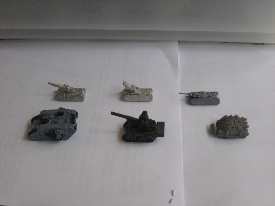 Baccus CHH7 medium tanks (heavy weapons) covers the first two -SF15 Main battle tank with twin medium laser (guess only) and SF14 MBT with hi velocity cannon. The next two do not appear to be in the Baccus range- SF46 MBT counter radar vehicle and SF45 "Driller" anti robo worm torpedo vehicle. Front row land raider, basilisk and metal rhino for size comparison.