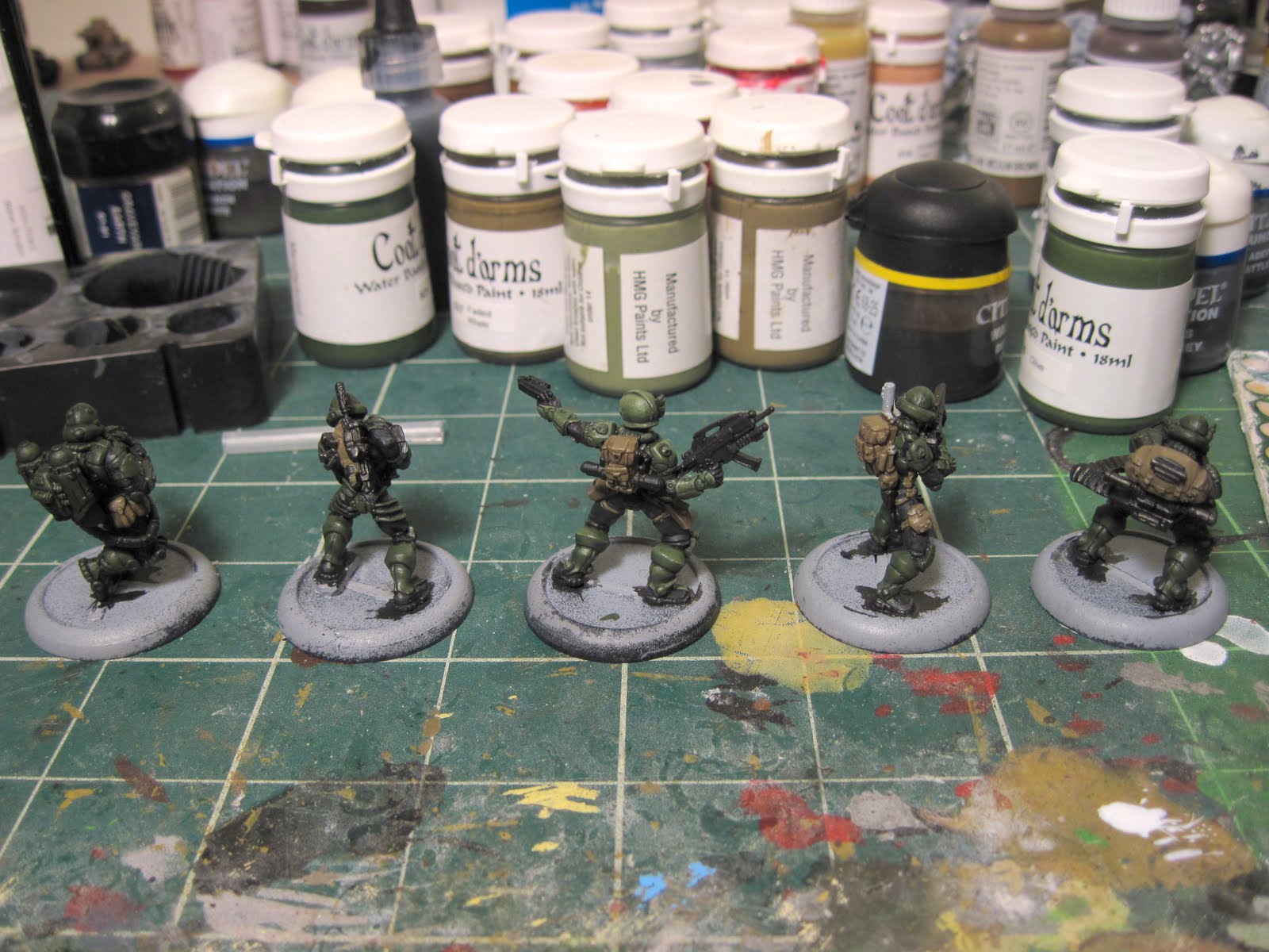 As for the CCC figs, I finished the black undersuit and began work on the webbing and what not this week. I think after a highlight I'm going to try some color bleeding with a dark green/brown color to tone it down.