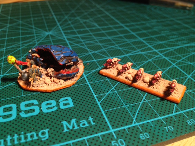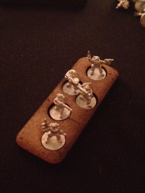 This shows the three potential bases for my big mutants. Either a standard sized infantry base, a heavy weapons sized base, or a small artillery base. The mutants weapons seem to hang over the side of the infantry base, and I think they will make the base fall over as they are a little top heavy. I'm thinking of using the larger hollow base on the back left of the first photo. Would this be a ridiculous size?
