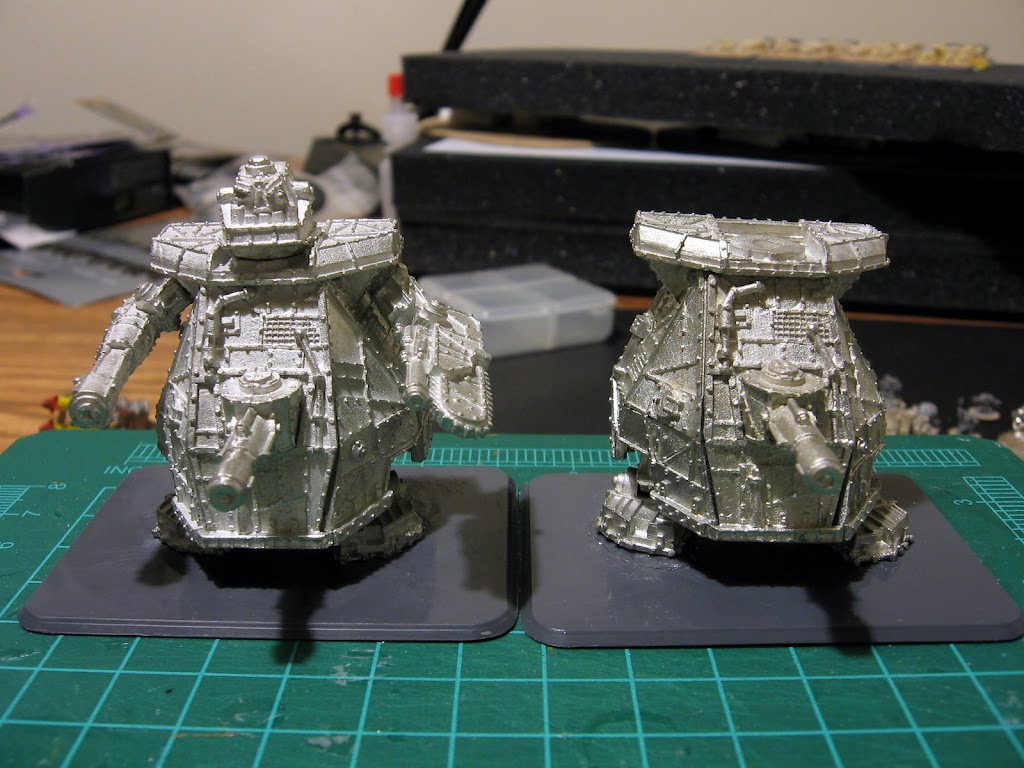 My two Gargants (named De and Dum and this point). I magnetized the Big Choppa arms in the hopes of later converting some Soopa/Supa-Zap guns for them. Dum needs a little more work and puttying but he's almost there. After them I'll have a Great Gargant to build.