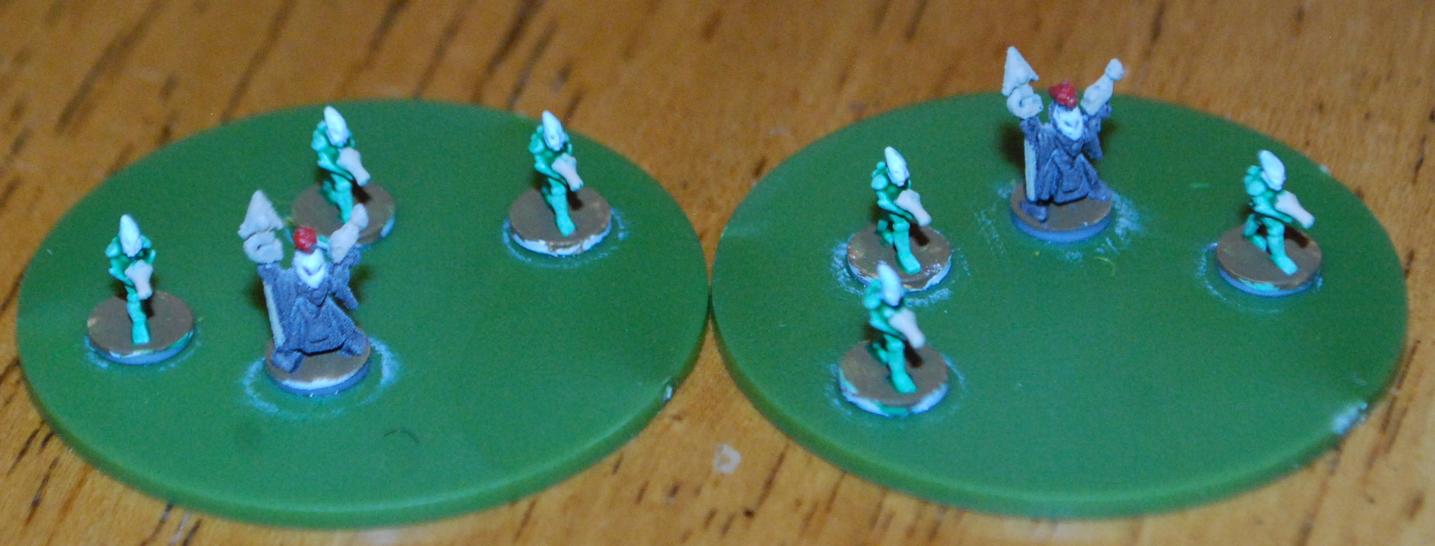Now with the models painted, I popped them off the balsa strips and started super gluing them to the metal bases. I have decided to put 4 models per base for the elder. I'm not sure if I will change this number for other forces, but it seems to work for these guys.