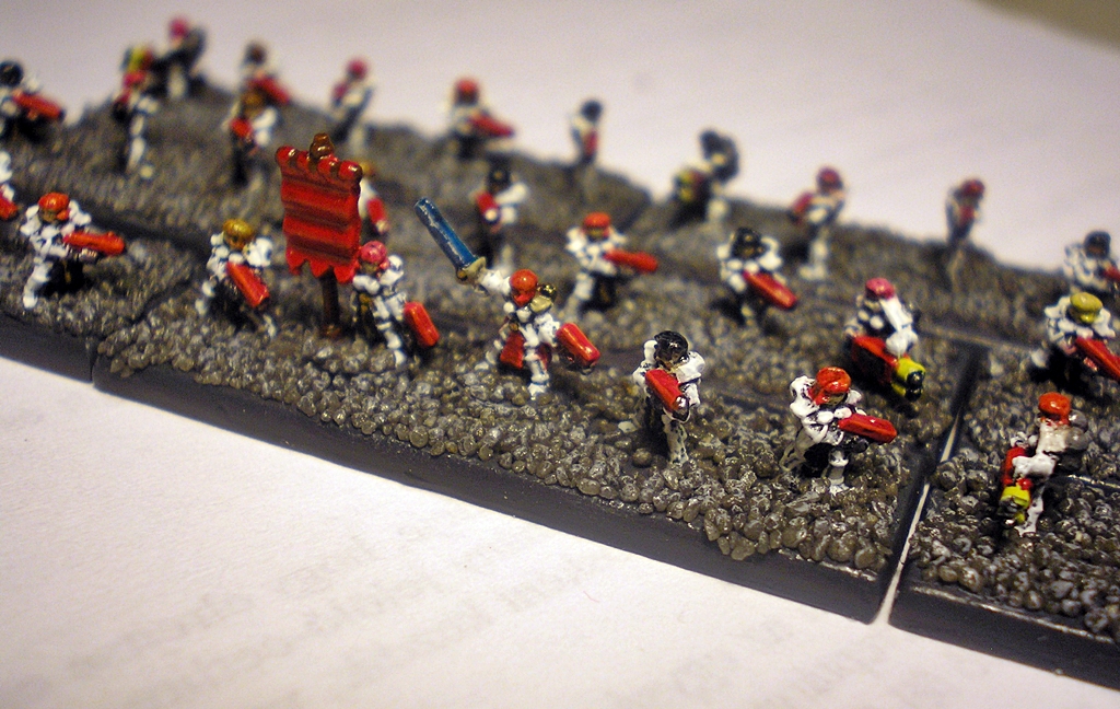 I prefer the manga/anime look of the Onslaught minis, so I want to use a bit more color on them (like the strong light blue on the Flamers, etc). This means, I need a "boring" basing scheme (a gray one, like this), but I'm not satisfied with a base this simple.. And also some 10/15mm Medieval decals are still missing (for the banner, etc).