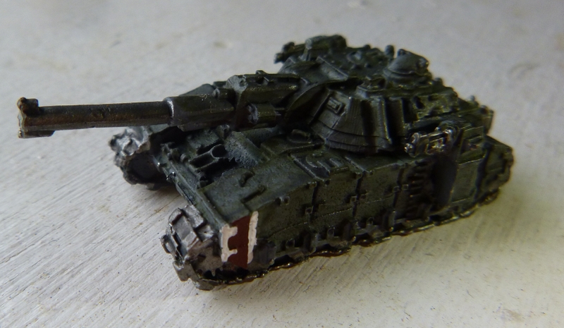 File comment: This is my first completed miniature, a Shadowsword. I'm going to assembly line the rest of the army, but I got over-excited and finished this one. At some point I want to go back and add more colors for small details. I've heard a "realistic" color palate won't show as well on the table at 6mm, but that dirty subdued vibe seemed to fit the SL for me.