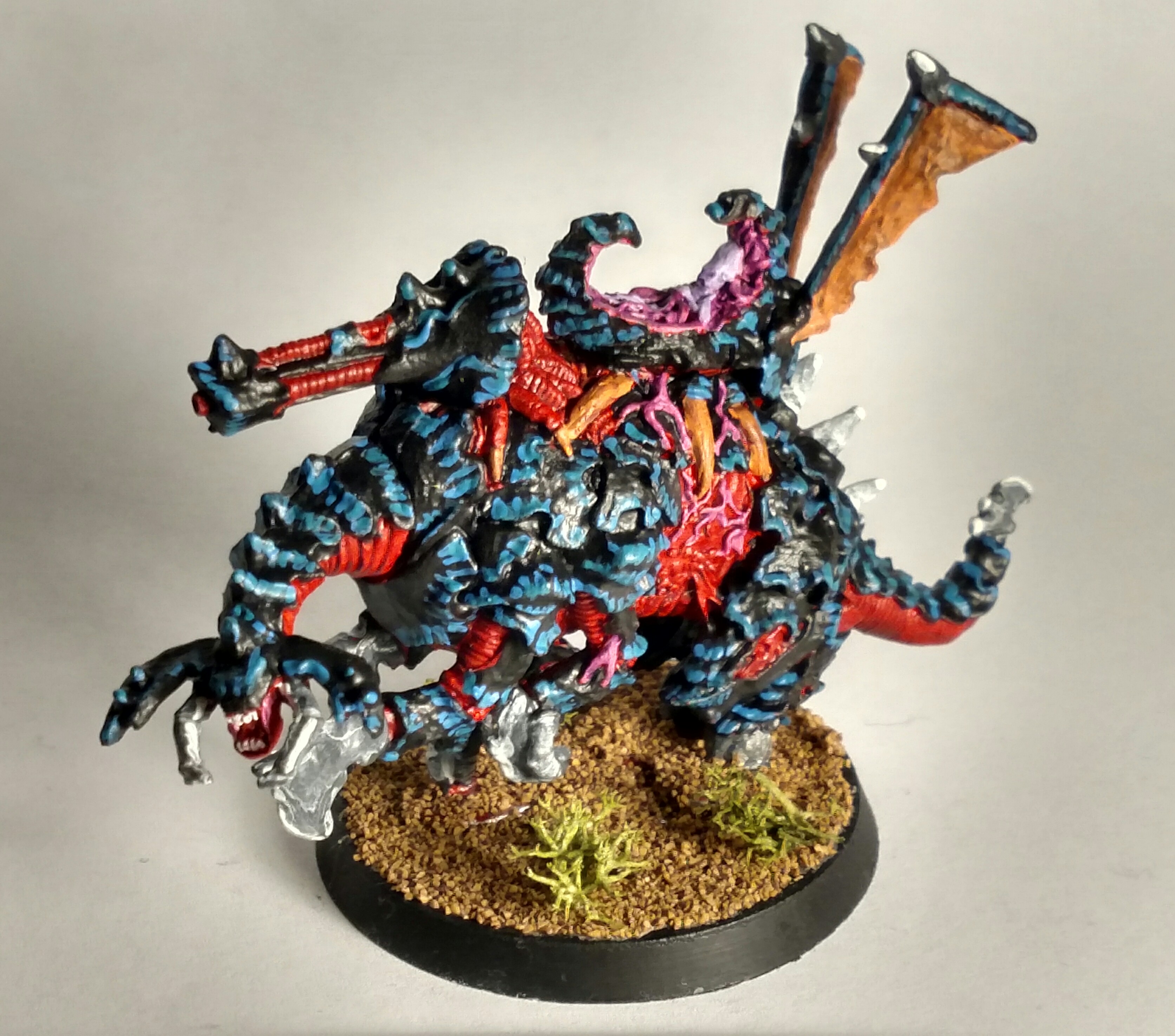 So I haven't posted in far too long. My recent project for 2015 is putting together a Nid army. I bought some old forumware awhile back that had been painted very well as Hive Behemoth. So, following in those colors, here's my first model done, the Dominatrix.