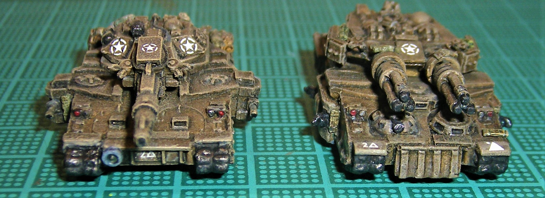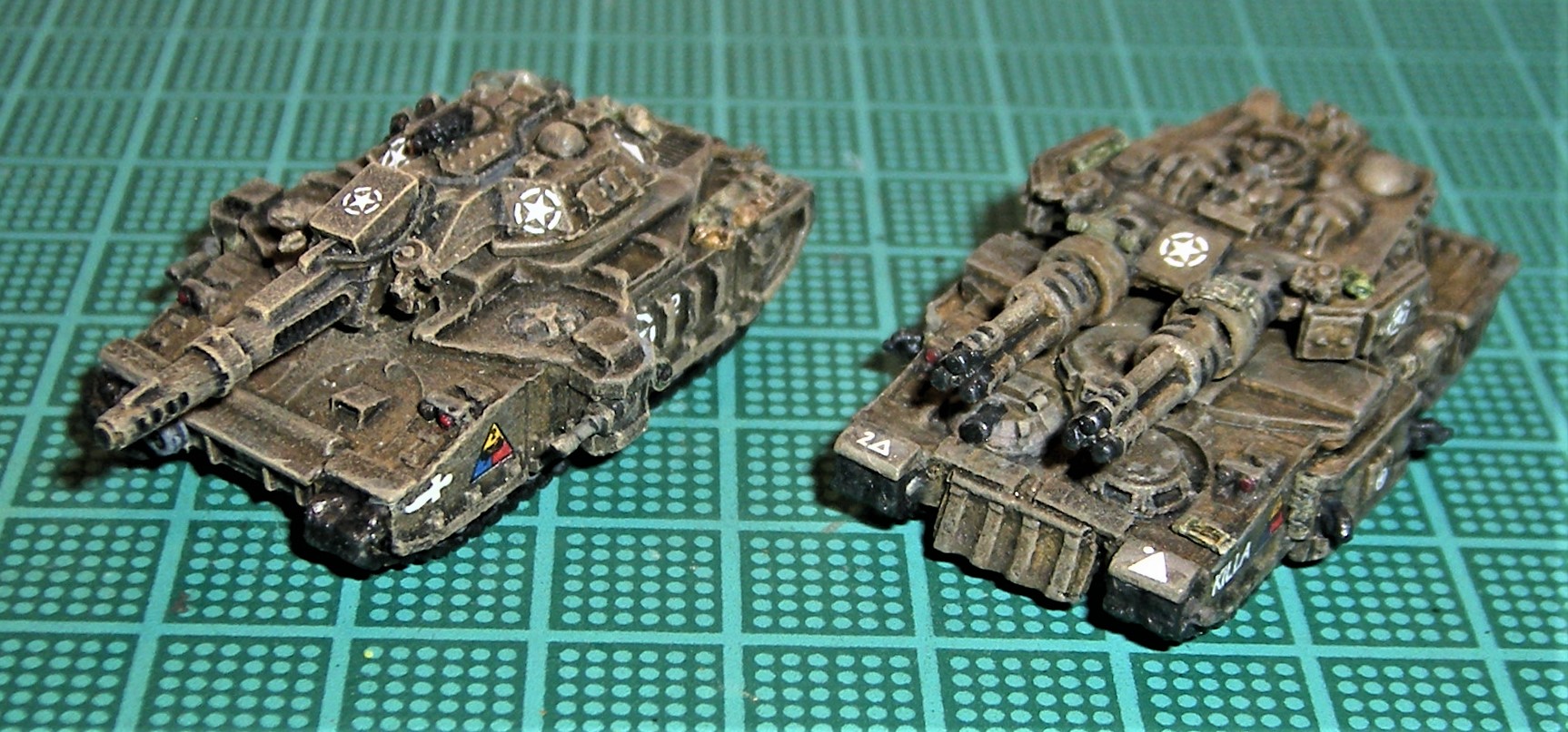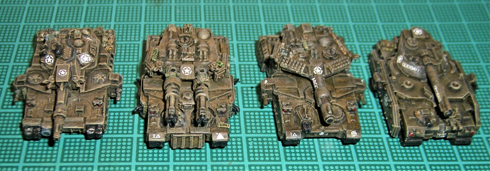 Just finished the 2d Det of Super Heavies[2d Armor Div. "Hell On Wheels] that I will use as Baneblades. The Hulls are OOP Exodus Wars + parts from Vanguard + bitz ... Working on the Command Tank now ...