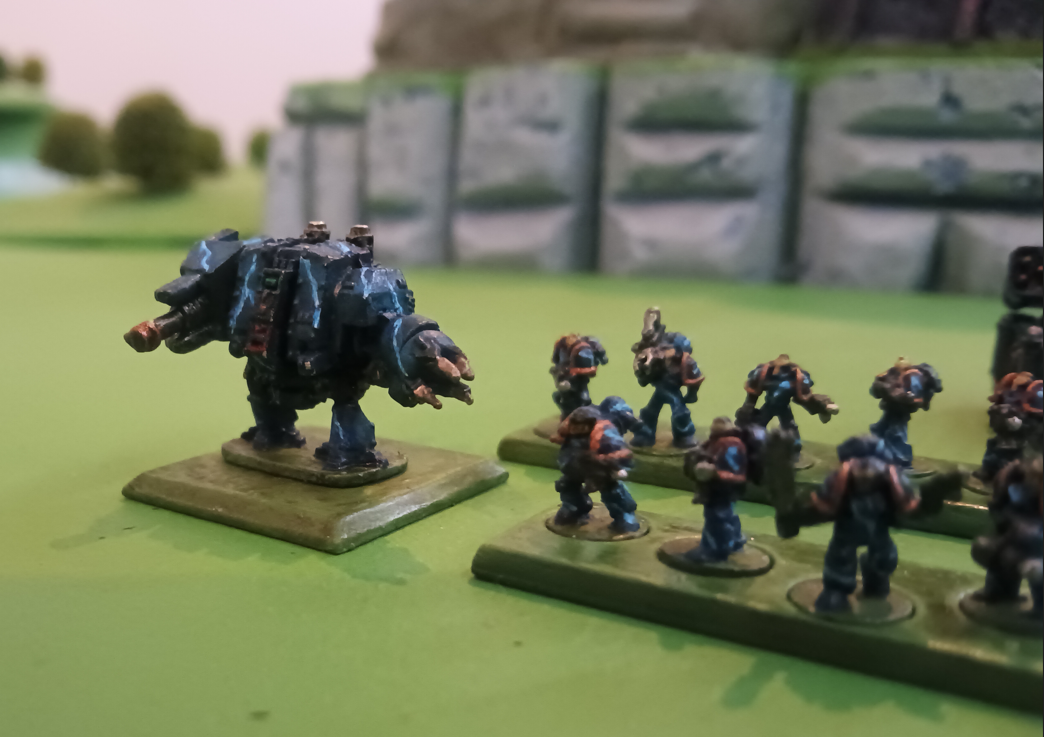I have had 2 games fairly recently with the Night Lords. The first game was against an Iron Warriors army. The IW pushed heavily down the center of the battlefield, running over the few NL formations in their way. The IW Battleship dropped a Chosen formation close to the Blitz which they succeeded in taking, pin-point attacks reduced the NL Warhound Titan to 1 damage point, then it was finished off by IW tanks.