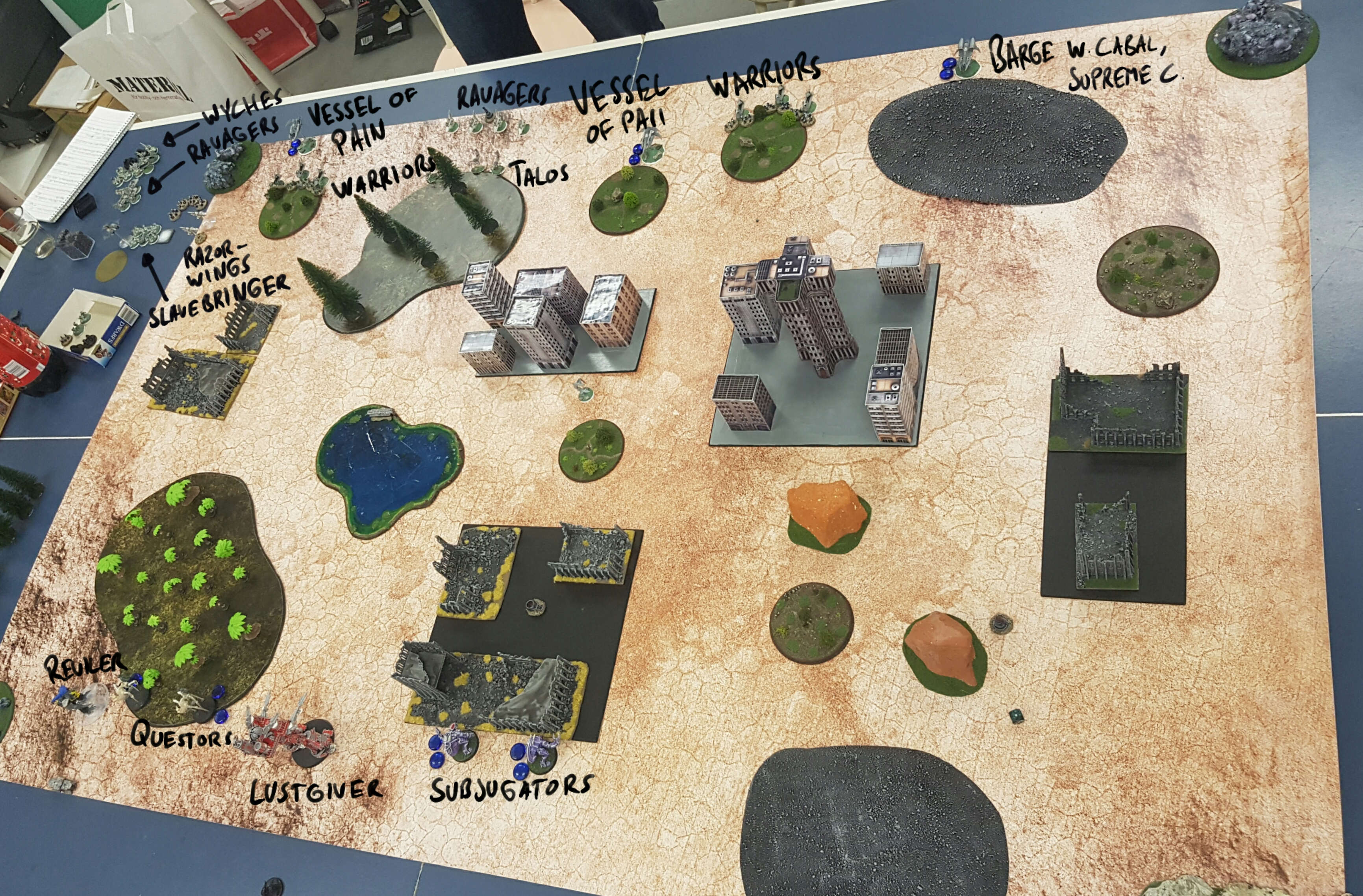 A very odd game. The list I took was more a "try a bit of everything to see how it works" while my opponent was fielding a very sharp tournament list. The strategy of having tough units rather than several weaker ones was pretty good, as my opponent ended up spending way more time on the Subjugators than he would otherwise have done. Heavy, unflankable formations such as these are difficult for Dark Eldar to deal with.